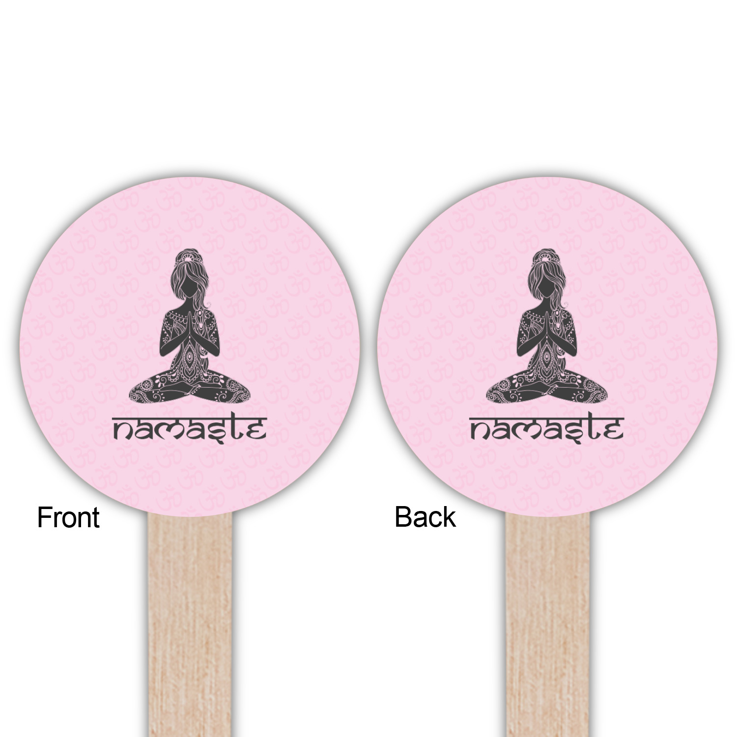 This design is customizable. We chose to use the om background with two shades of pink. We have other yoga backgrounds that you can choose from. We chose the large graphic and text style, where the graphic is of a beautiful woman sitting in lotus pose with prayer hands in pink and dark grey. We have many different yoga graphics that you can choose from including the tree pose and meditation pose. We chose to use the word Namaste in the Sanskrit font. You can choose the personalization, the font and the colors.