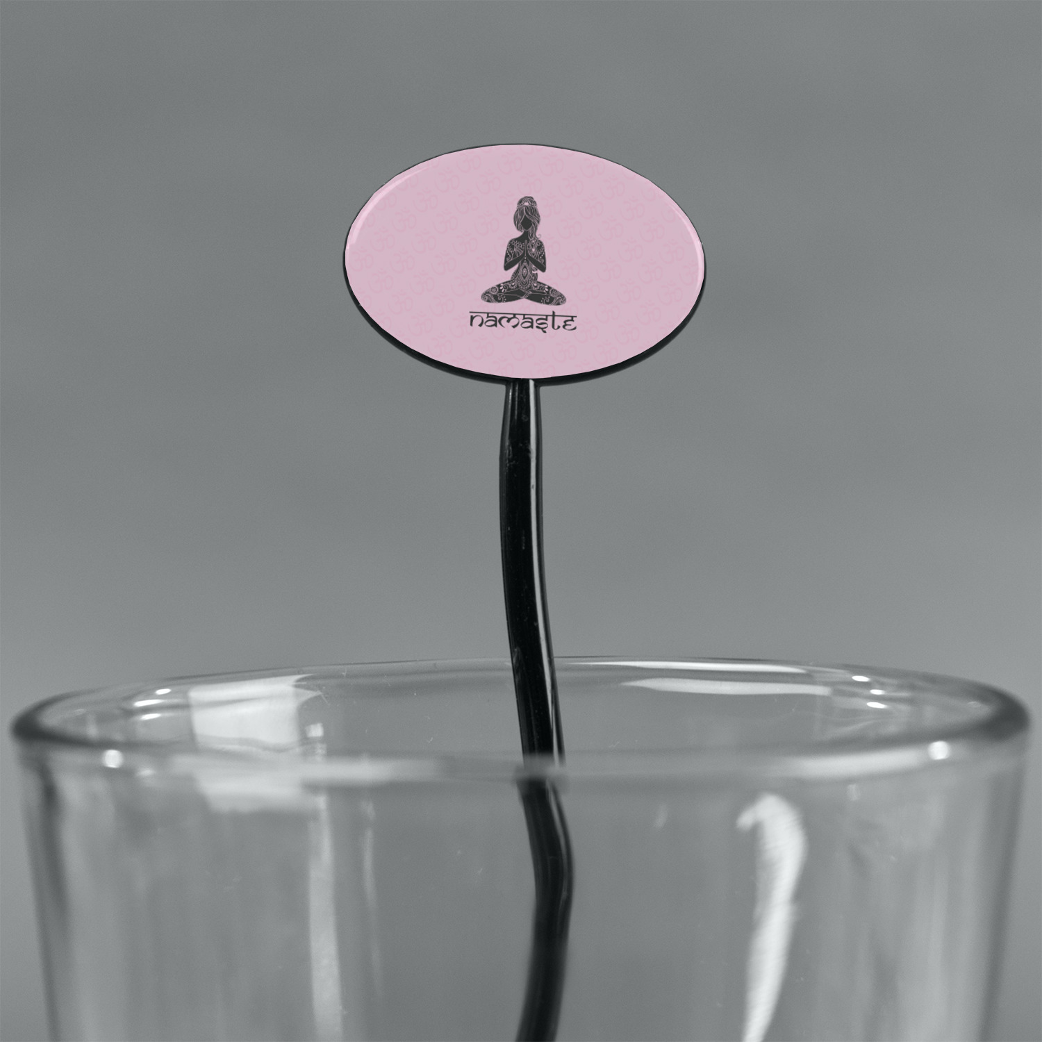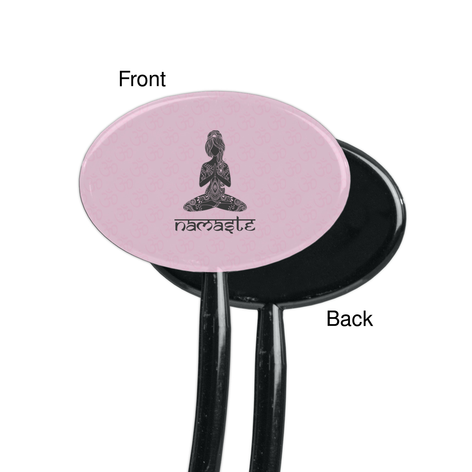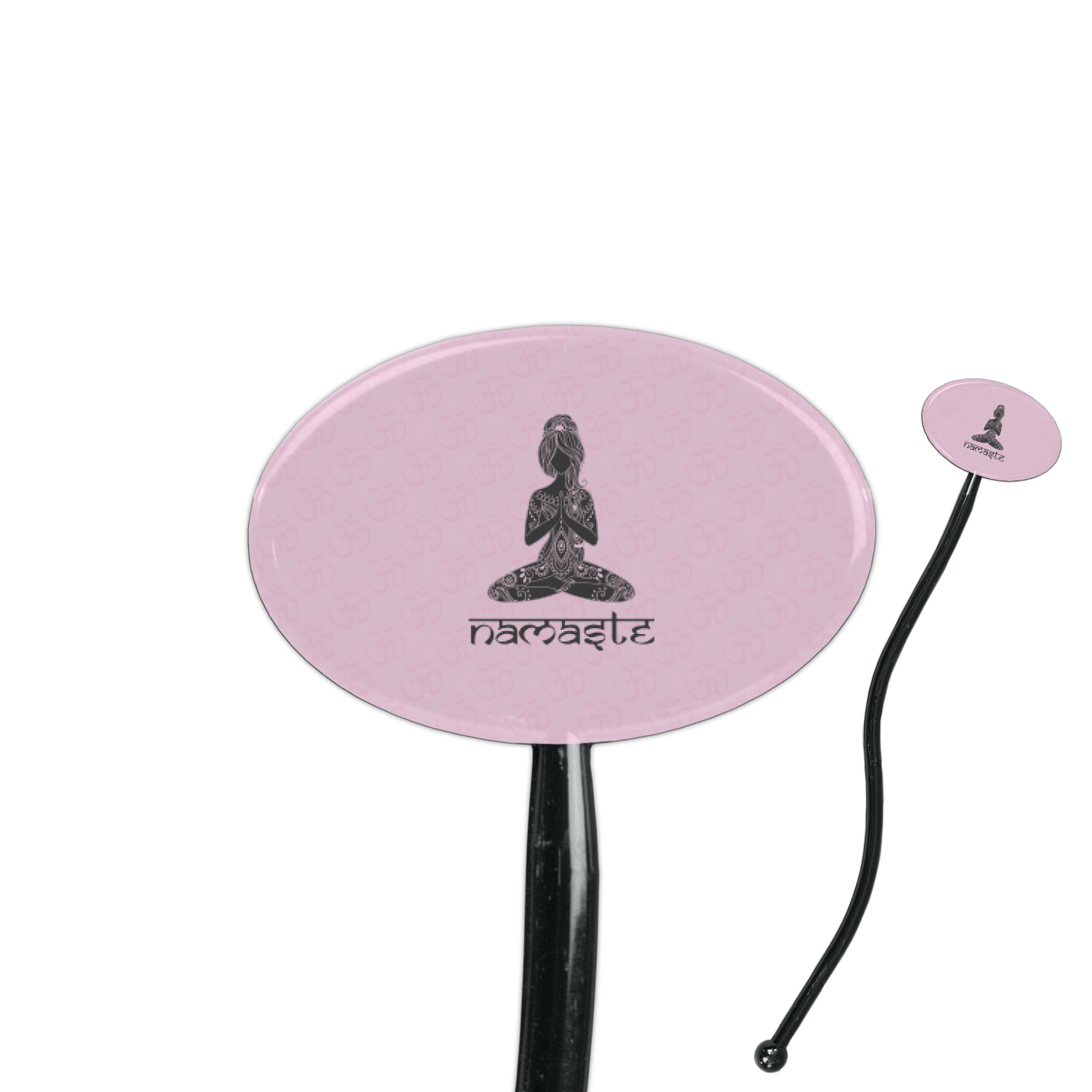 This design is customizable. We chose to use the om background with two shades of pink. We have other yoga backgrounds that you can choose from. We chose the large graphic and text style, where the graphic is of a beautiful woman sitting in lotus pose with prayer hands in pink and dark grey. We have many different yoga graphics that you can choose from including the tree pose and meditation pose. We chose to use the word Namaste in the Sanskrit font. You can choose the personalization, the font and the colors.