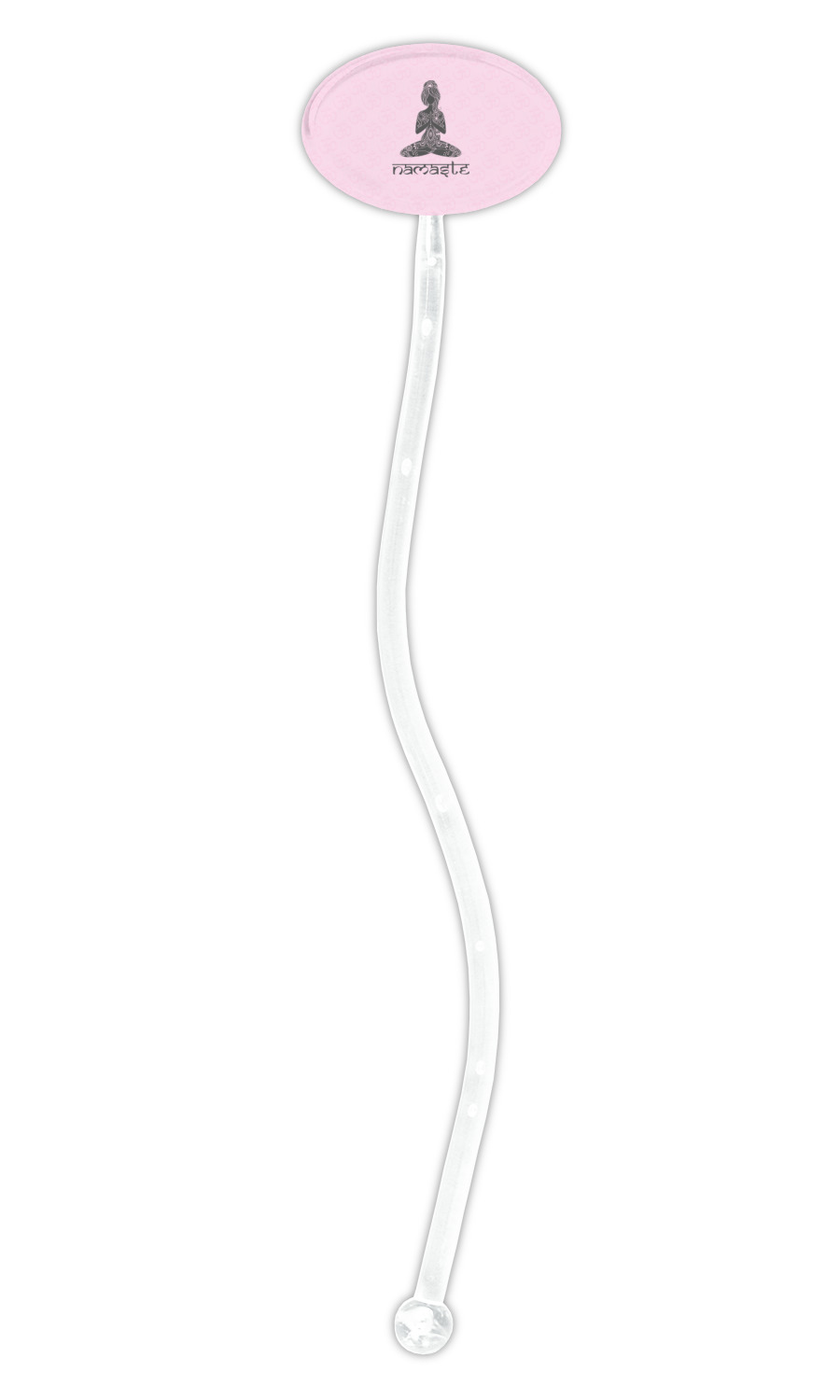 This design is customizable. We chose to use the om background with two shades of pink. We have other yoga backgrounds that you can choose from. We chose the large graphic and text style, where the graphic is of a beautiful woman sitting in lotus pose with prayer hands in pink and dark grey. We have many different yoga graphics that you can choose from including the tree pose and meditation pose. We chose to use the word Namaste in the Sanskrit font. You can choose the personalization, the font and the colors.