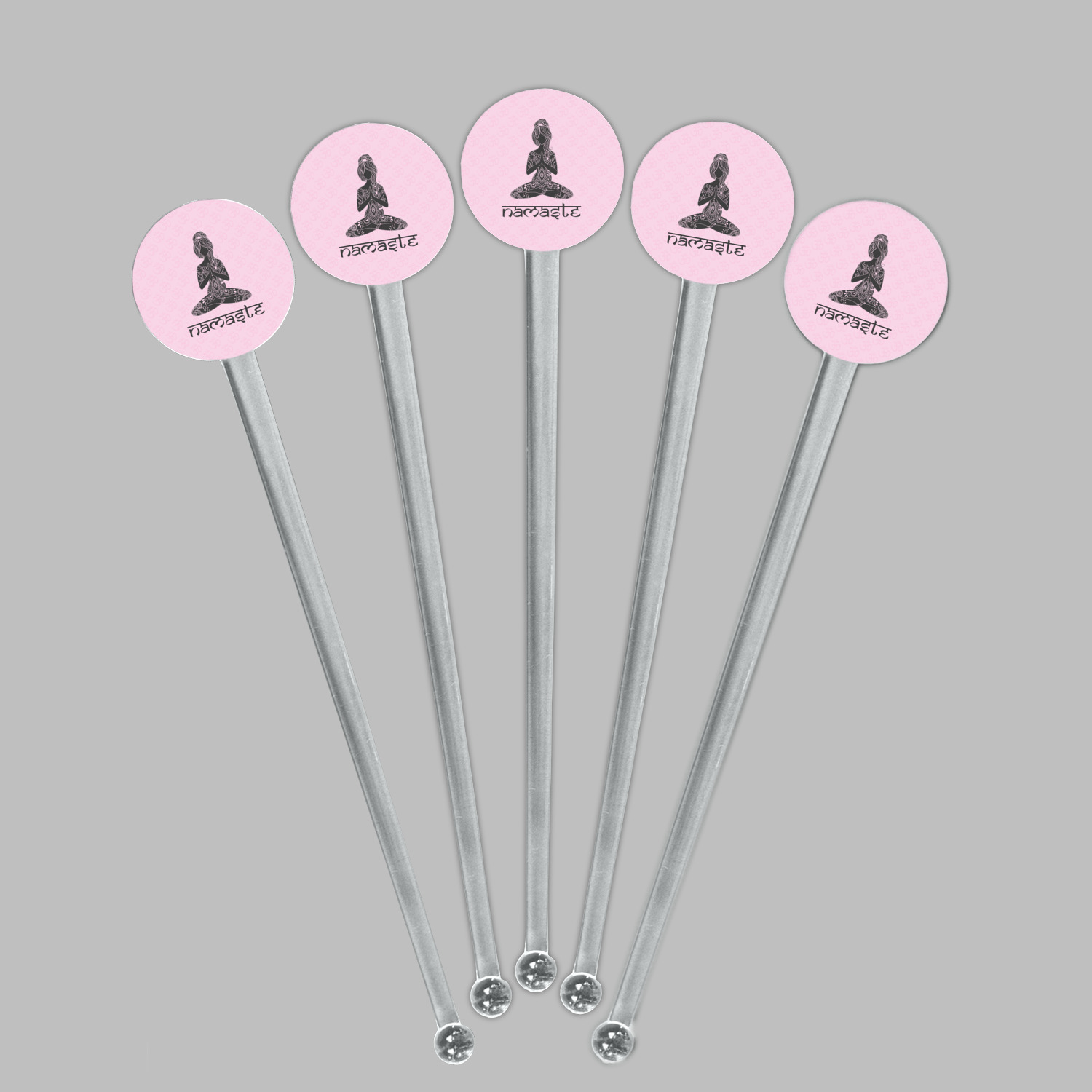 This design is customizable. We chose to use the om background with two shades of pink. We have other yoga backgrounds that you can choose from. We chose the large graphic and text style, where the graphic is of a beautiful woman sitting in lotus pose with prayer hands in pink and dark grey. We have many different yoga graphics that you can choose from including the tree pose and meditation pose. We chose to use the word Namaste in the Sanskrit font. You can choose the personalization, the font and the colors.