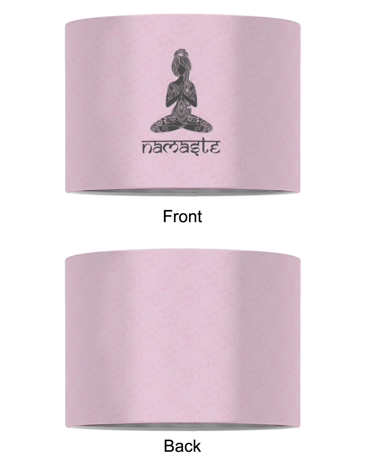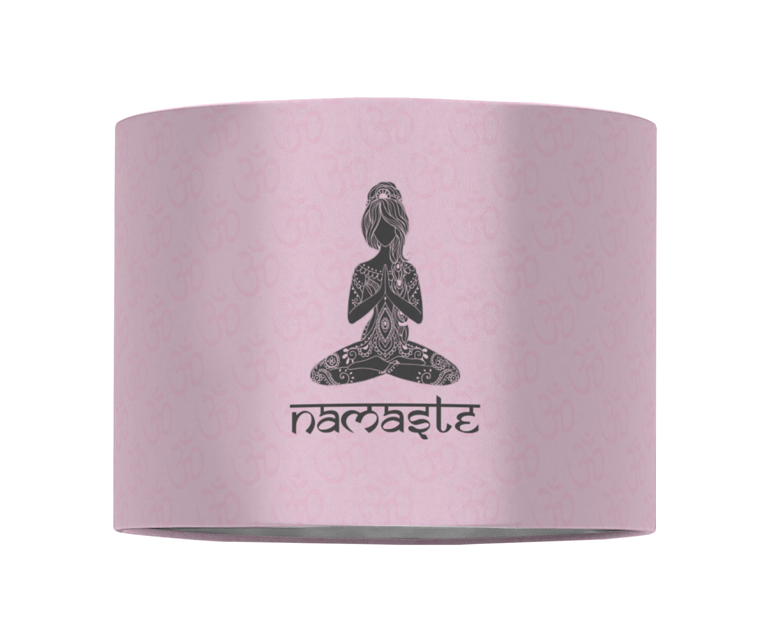 This design is customizable. We chose to use the om background with two shades of pink. We have other yoga backgrounds that you can choose from. We chose the large graphic and text style, where the graphic is of a beautiful woman sitting in lotus pose with prayer hands in pink and dark grey. We have many different yoga graphics that you can choose from including the tree pose and meditation pose. We chose to use the word Namaste in the Sanskrit font. You can choose the personalization, the font and the colors.