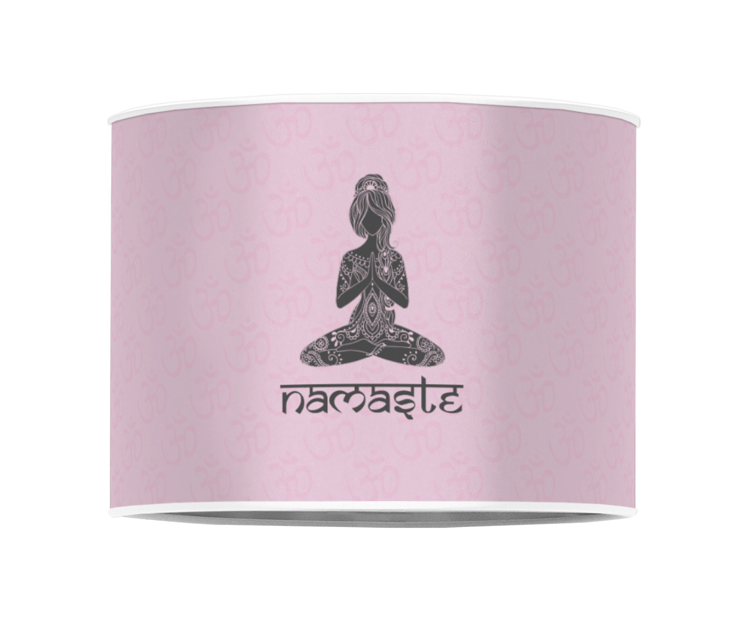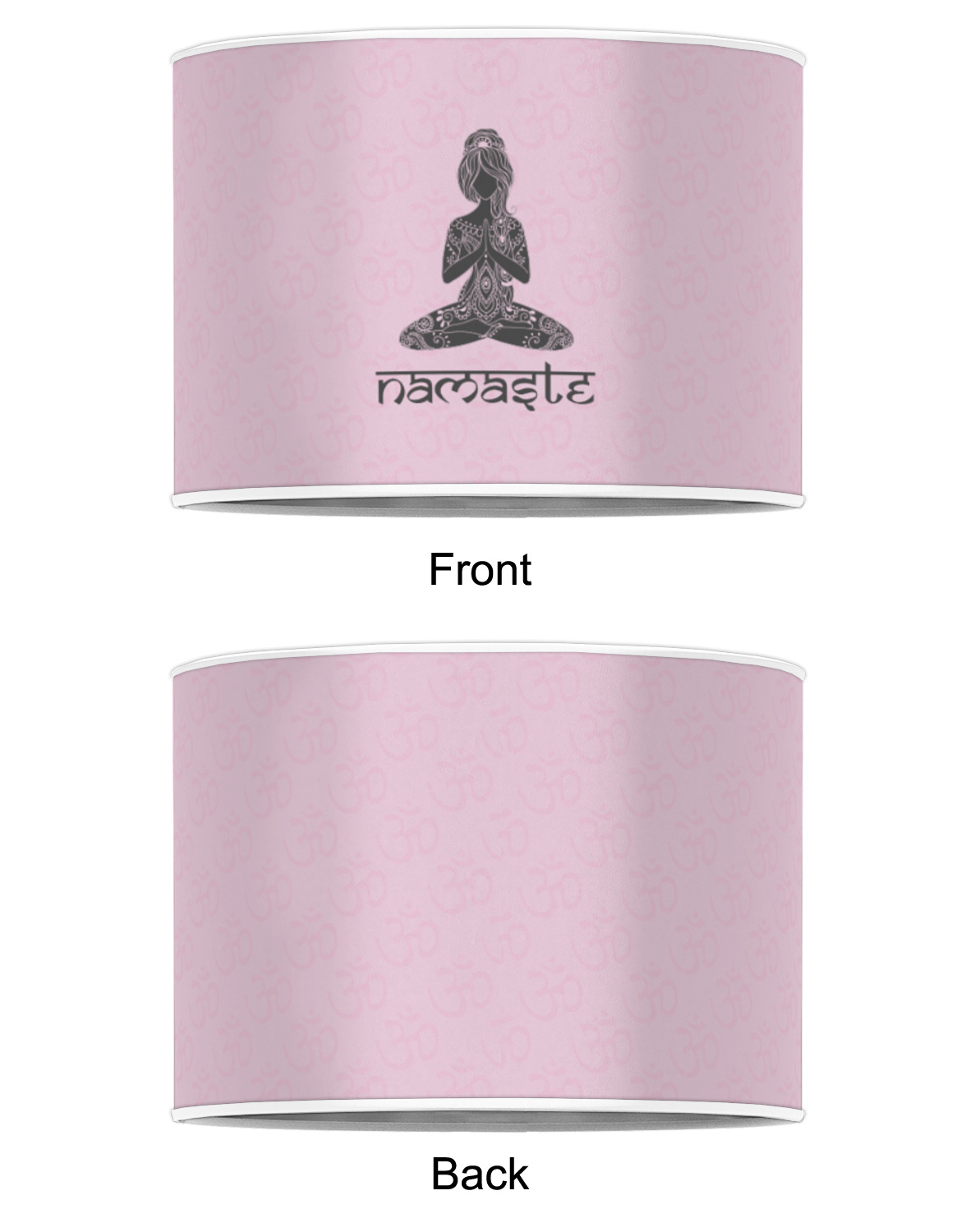 This design is customizable. We chose to use the om background with two shades of pink. We have other yoga backgrounds that you can choose from. We chose the large graphic and text style, where the graphic is of a beautiful woman sitting in lotus pose with prayer hands in pink and dark grey. We have many different yoga graphics that you can choose from including the tree pose and meditation pose. We chose to use the word Namaste in the Sanskrit font. You can choose the personalization, the font and the colors.