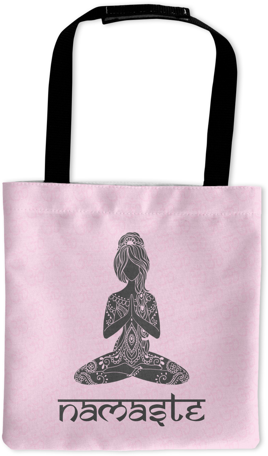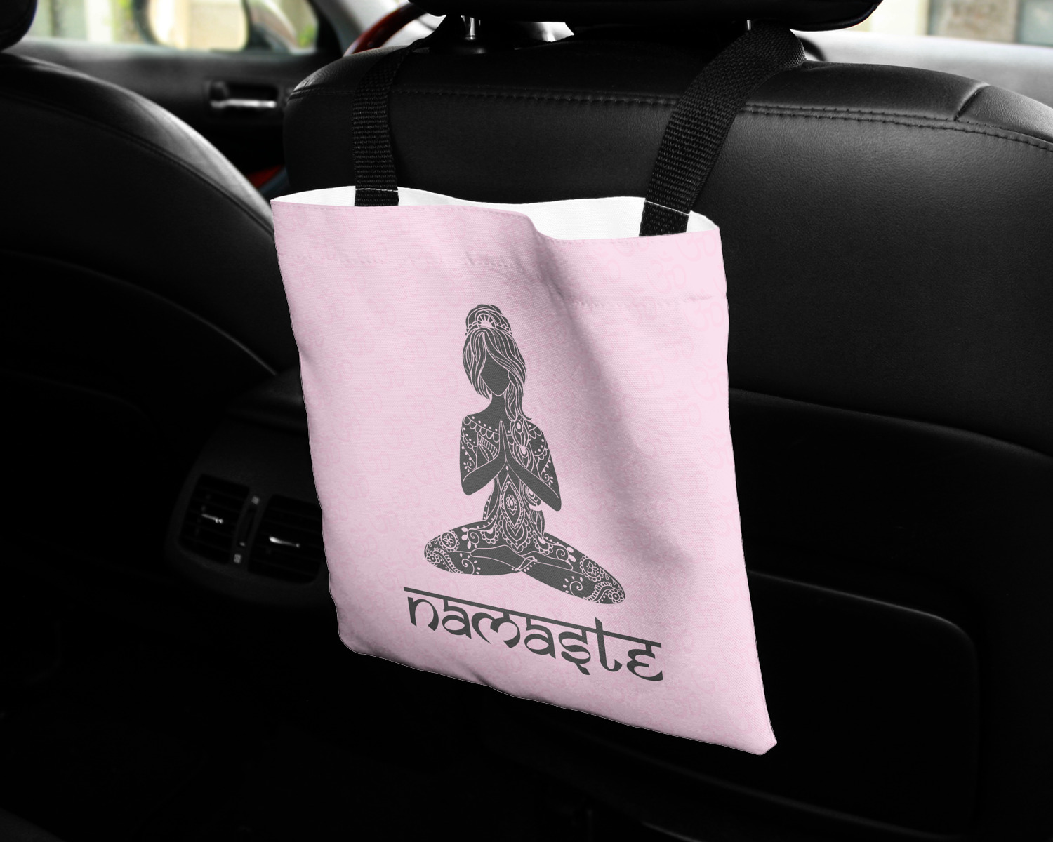 This design is customizable. We chose to use the om background with two shades of pink. We have other yoga backgrounds that you can choose from. We chose the large graphic and text style, where the graphic is of a beautiful woman sitting in lotus pose with prayer hands in pink and dark grey. We have many different yoga graphics that you can choose from including the tree pose and meditation pose. We chose to use the word Namaste in the Sanskrit font. You can choose the personalization, the font and the colors.