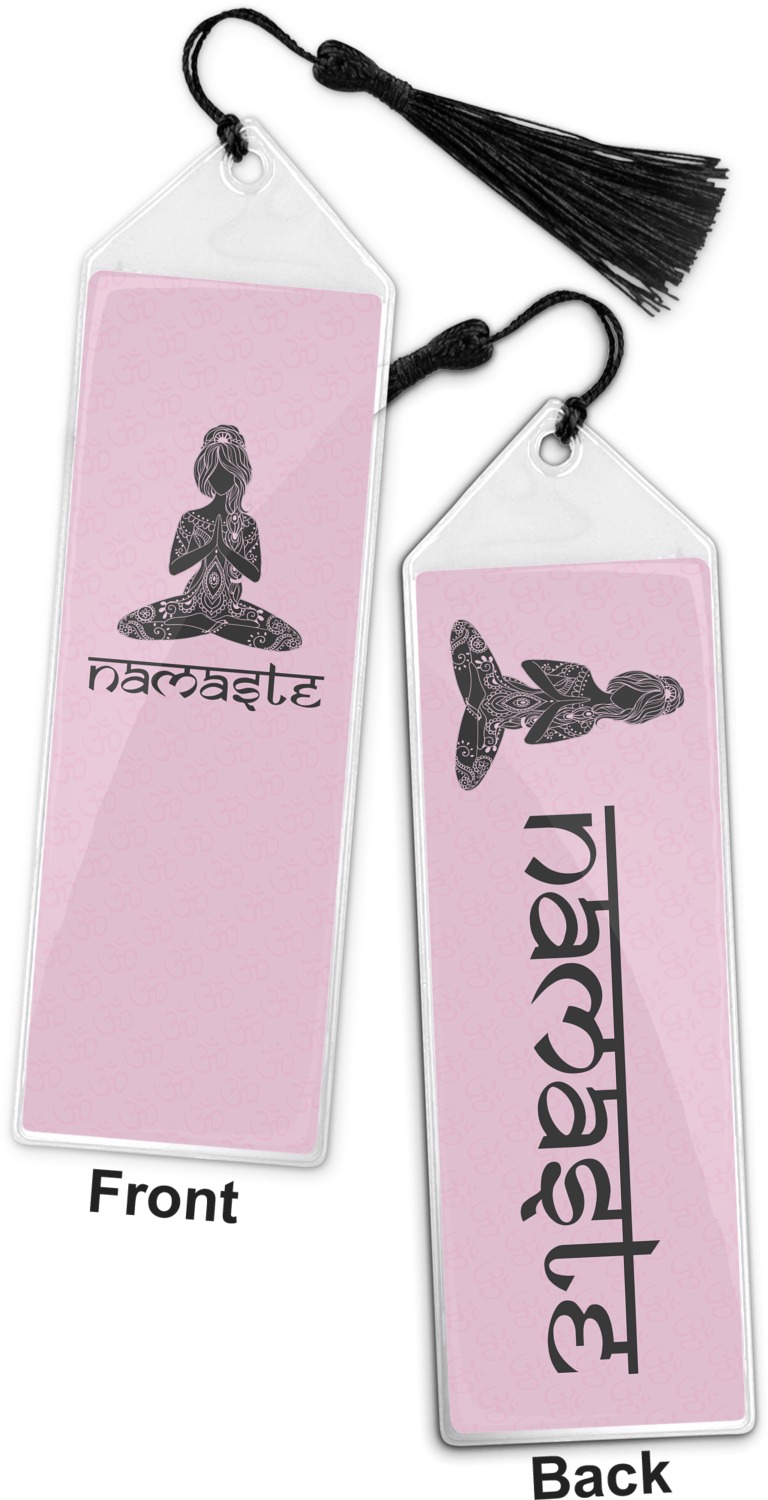 Your personalized bookmark is made of a sturdy, clear vinyl, and is approximately 7.5" x 2.25". We display your personalization on vinyl inserts that are placed on both sides. Accompanying each book marker is a black, fringe tassel that attaches to the reinforced, triangular header.
