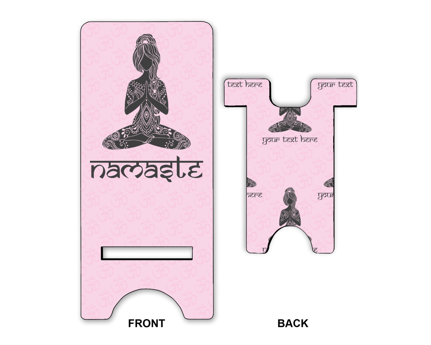This design is customizable. We chose to use the om background with two shades of pink. We have other yoga backgrounds that you can choose from. We chose the large graphic and text style, where the graphic is of a beautiful woman sitting in lotus pose with prayer hands in pink and dark grey. We have many different yoga graphics that you can choose from including the tree pose and meditation pose. We chose to use the word Namaste in the Sanskrit font. You can choose the personalization, the font and the colors.