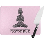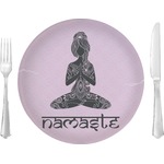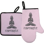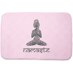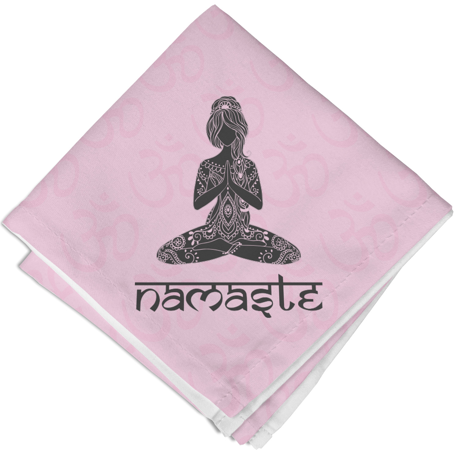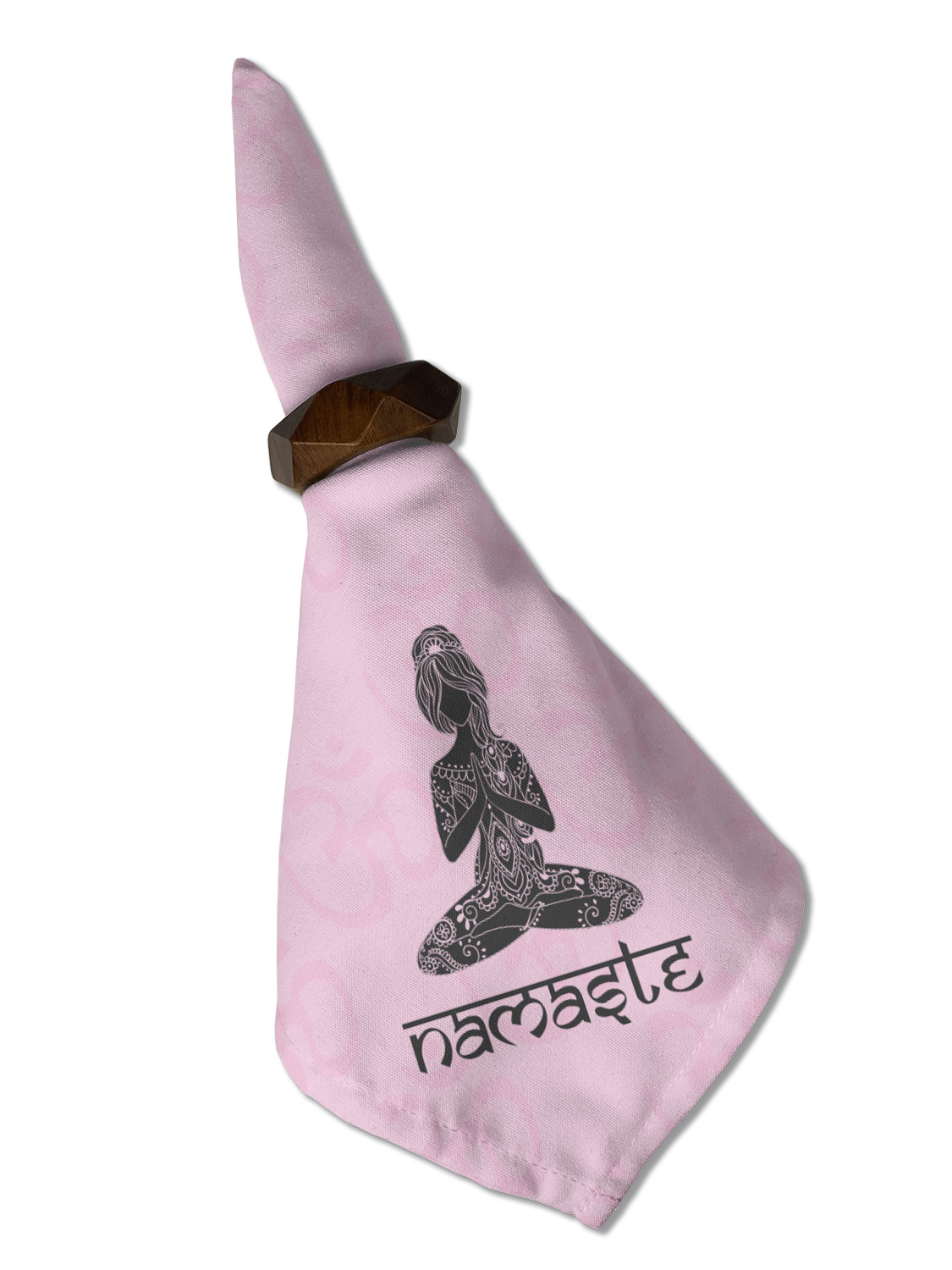 This design is customizable. We chose to use the om background with two shades of pink. We have other yoga backgrounds that you can choose from. We chose the large graphic and text style, where the graphic is of a beautiful woman sitting in lotus pose with prayer hands in pink and dark grey. We have many different yoga graphics that you can choose from including the tree pose and meditation pose. We chose to use the word Namaste in the Sanskrit font. You can choose the personalization, the font and the colors.