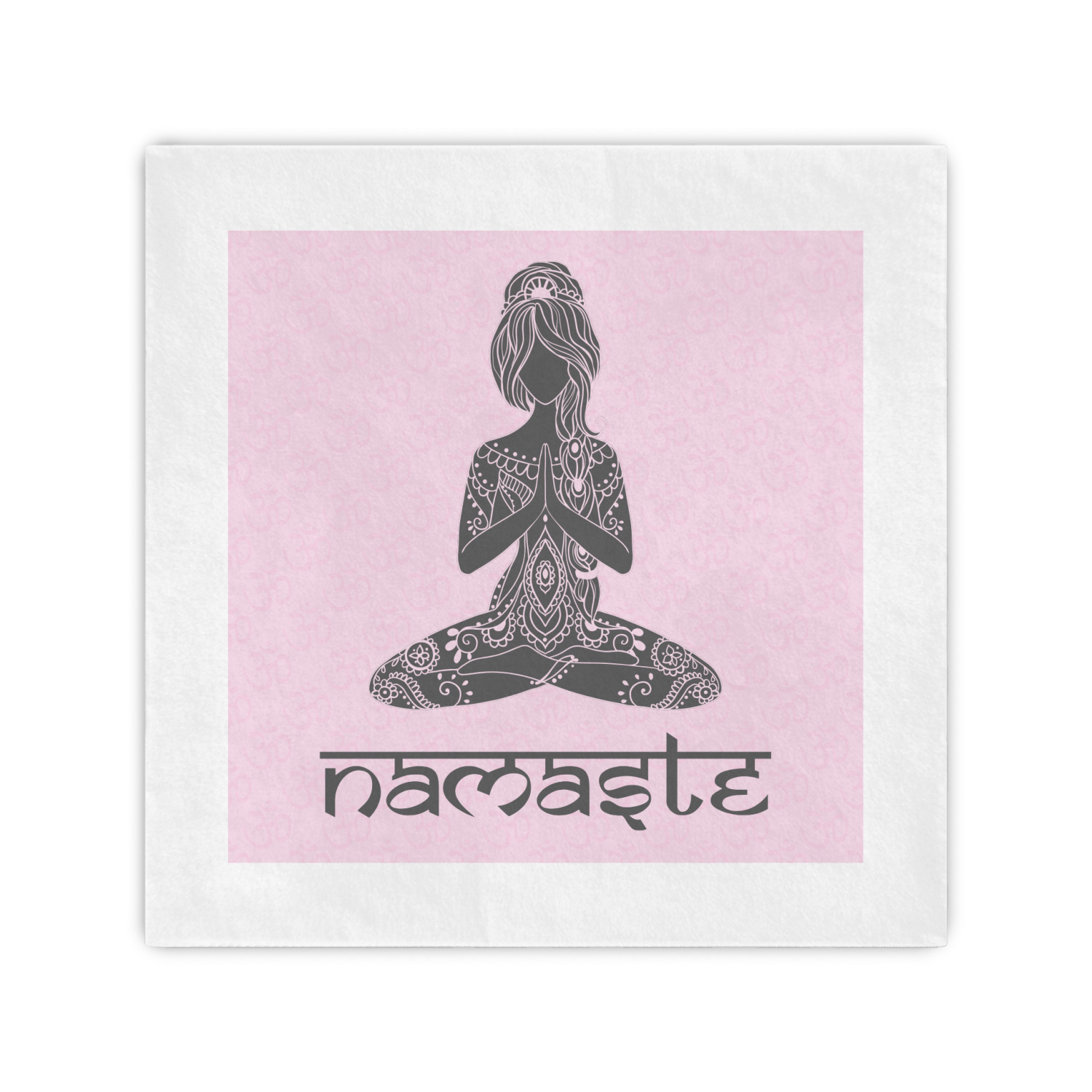 This design is customizable. We chose to use the om background with two shades of pink. We have other yoga backgrounds that you can choose from. We chose the large graphic and text style, where the graphic is of a beautiful woman sitting in lotus pose with prayer hands in pink and dark grey. We have many different yoga graphics that you can choose from including the tree pose and meditation pose. We chose to use the word Namaste in the Sanskrit font. You can choose the personalization, the font and the colors.