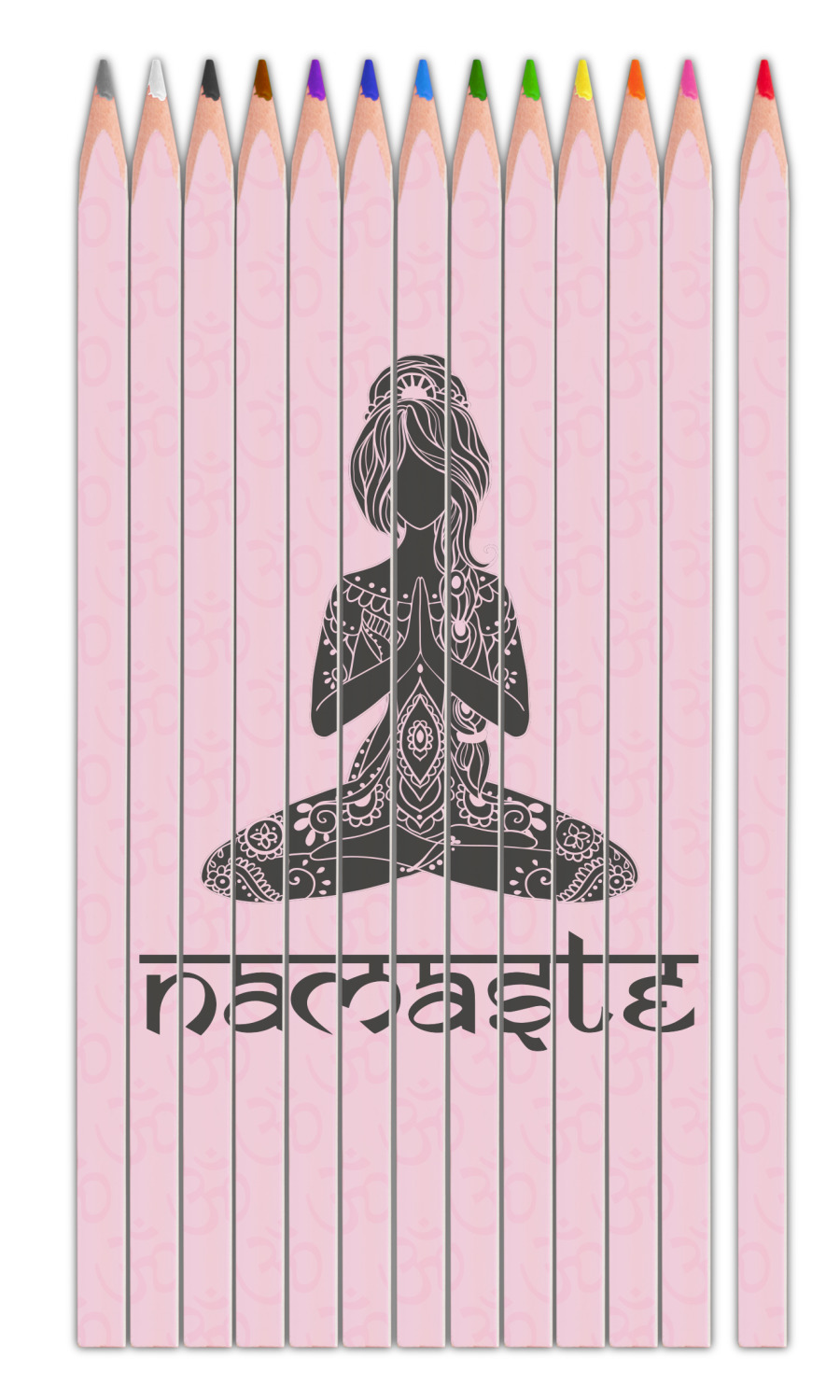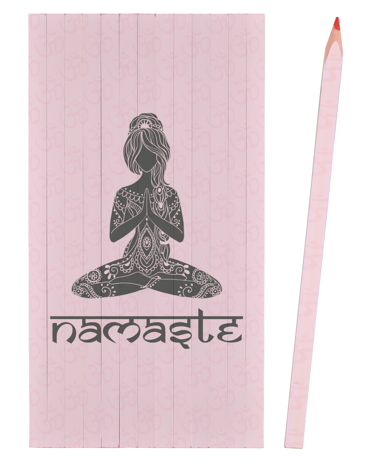 This design is customizable. We chose to use the om background with two shades of pink. We have other yoga backgrounds that you can choose from. We chose the large graphic and text style, where the graphic is of a beautiful woman sitting in lotus pose with prayer hands in pink and dark grey. We have many different yoga graphics that you can choose from including the tree pose and meditation pose. We chose to use the word Namaste in the Sanskrit font. You can choose the personalization, the font and the colors.