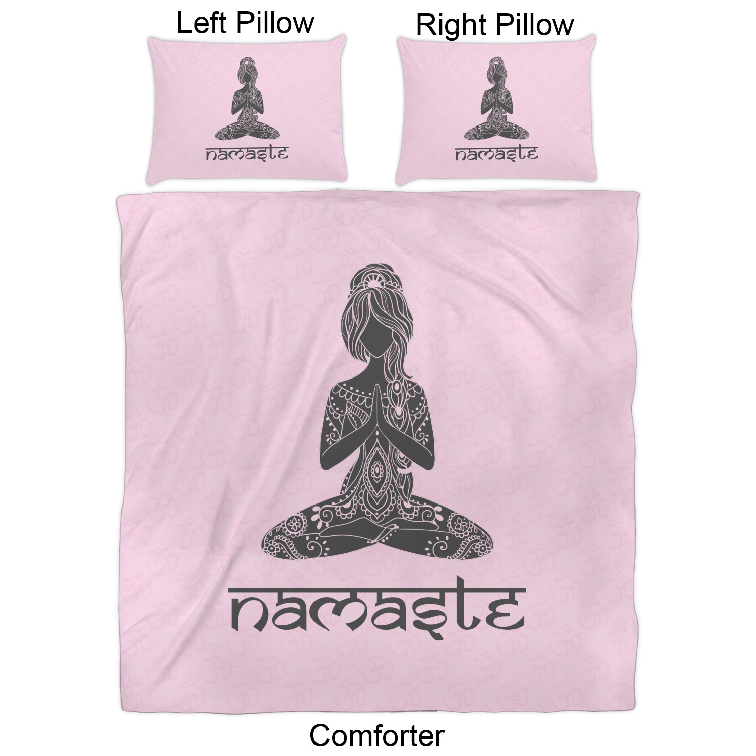 This design is customizable. We chose to use the om background with two shades of pink. We have other yoga backgrounds that you can choose from. We chose the large graphic and text style, where the graphic is of a beautiful woman sitting in lotus pose with prayer hands in pink and dark grey. We have many different yoga graphics that you can choose from including the tree pose and meditation pose. We chose to use the word Namaste in the Sanskrit font. You can choose the personalization, the font and the colors.