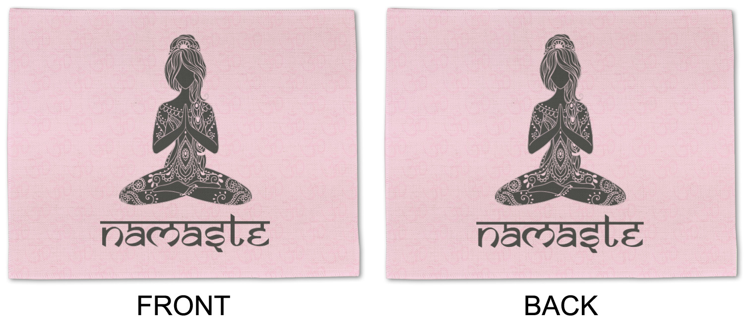 This design is customizable. We chose to use the om background with two shades of pink. We have other yoga backgrounds that you can choose from. We chose the large graphic and text style, where the graphic is of a beautiful woman sitting in lotus pose with prayer hands in pink and dark grey. We have many different yoga graphics that you can choose from including the tree pose and meditation pose. We chose to use the word Namaste in the Sanskrit font. You can choose the personalization, the font and the colors.