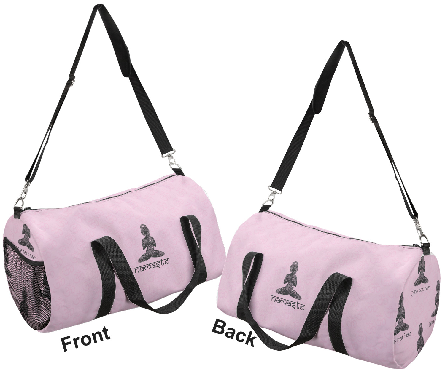 This duffle is a sturdy bag made of a canvas material. It comes in two sizes: Small (19"W x 9.5"H x 9.5"D) and Large (23"W x 12"H x 12"D). The bag is a cylindrical shape with a black adjustable strap and two handles. On one side is an elastic pouch to put a waterbottle or other small item. Your product will be sublimated with your design and is able to be designed on the front, back, and sides. Be sure to remember that the straps may cut into parts of your design if you upload your own artwork.