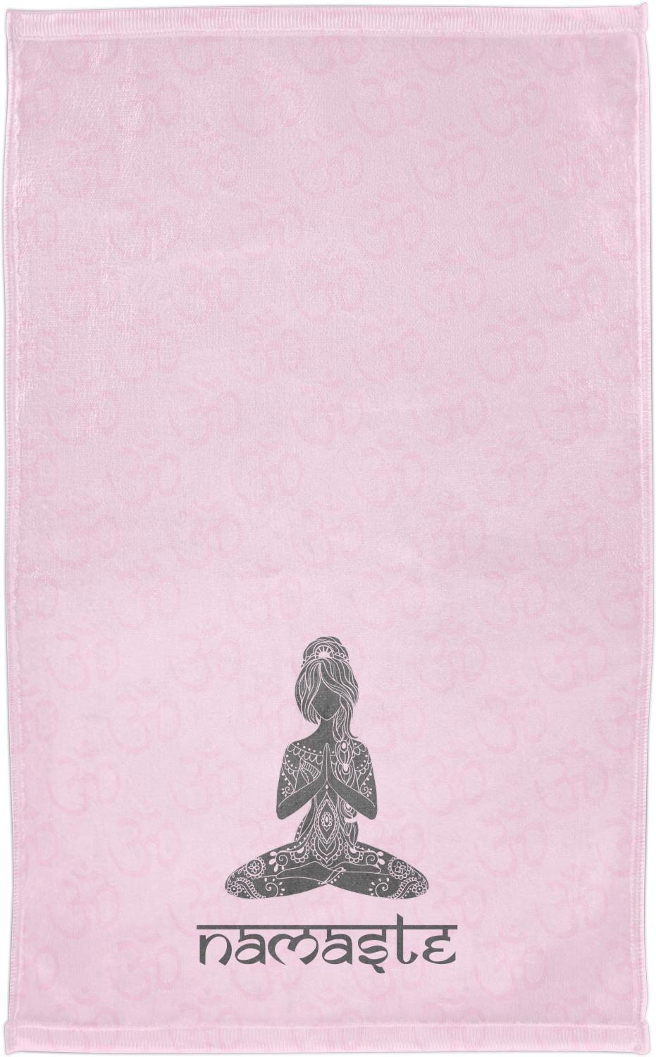 This design is customizable. We chose to use the om background with two shades of pink. We have other yoga backgrounds that you can choose from. We chose the large graphic and text style, where the graphic is of a beautiful woman sitting in lotus pose with prayer hands in pink and dark grey. We have many different yoga graphics that you can choose from including the tree pose and meditation pose. We chose to use the word Namaste in the Sanskrit font. You can choose the personalization, the font and the colors.