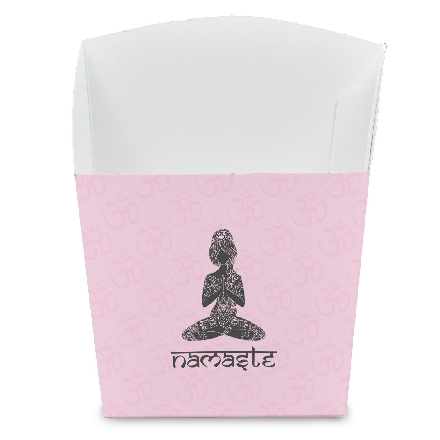 This design is customizable. We chose to use the om background with two shades of pink. We have other yoga backgrounds that you can choose from. We chose the large graphic and text style, where the graphic is of a beautiful woman sitting in lotus pose with prayer hands in pink and dark grey. We have many different yoga graphics that you can choose from including the tree pose and meditation pose. We chose to use the word Namaste in the Sanskrit font. You can choose the personalization, the font and the colors.