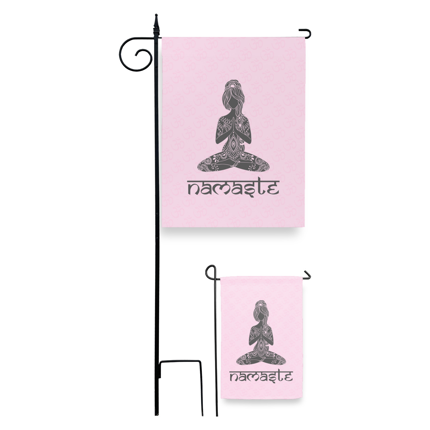 This design is customizable. We chose to use the om background with two shades of pink. We have other yoga backgrounds that you can choose from. We chose the large graphic and text style, where the graphic is of a beautiful woman sitting in lotus pose with prayer hands in pink and dark grey. We have many different yoga graphics that you can choose from including the tree pose and meditation pose. We chose to use the word Namaste in the Sanskrit font. You can choose the personalization, the font and the colors.