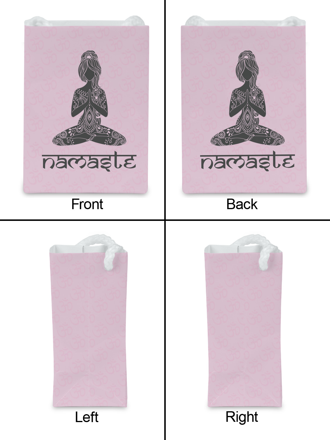 This design is customizable. We chose to use the om background with two shades of pink. We have other yoga backgrounds that you can choose from. We chose the large graphic and text style, where the graphic is of a beautiful woman sitting in lotus pose with prayer hands in pink and dark grey. We have many different yoga graphics that you can choose from including the tree pose and meditation pose. We chose to use the word Namaste in the Sanskrit font. You can choose the personalization, the font and the colors.