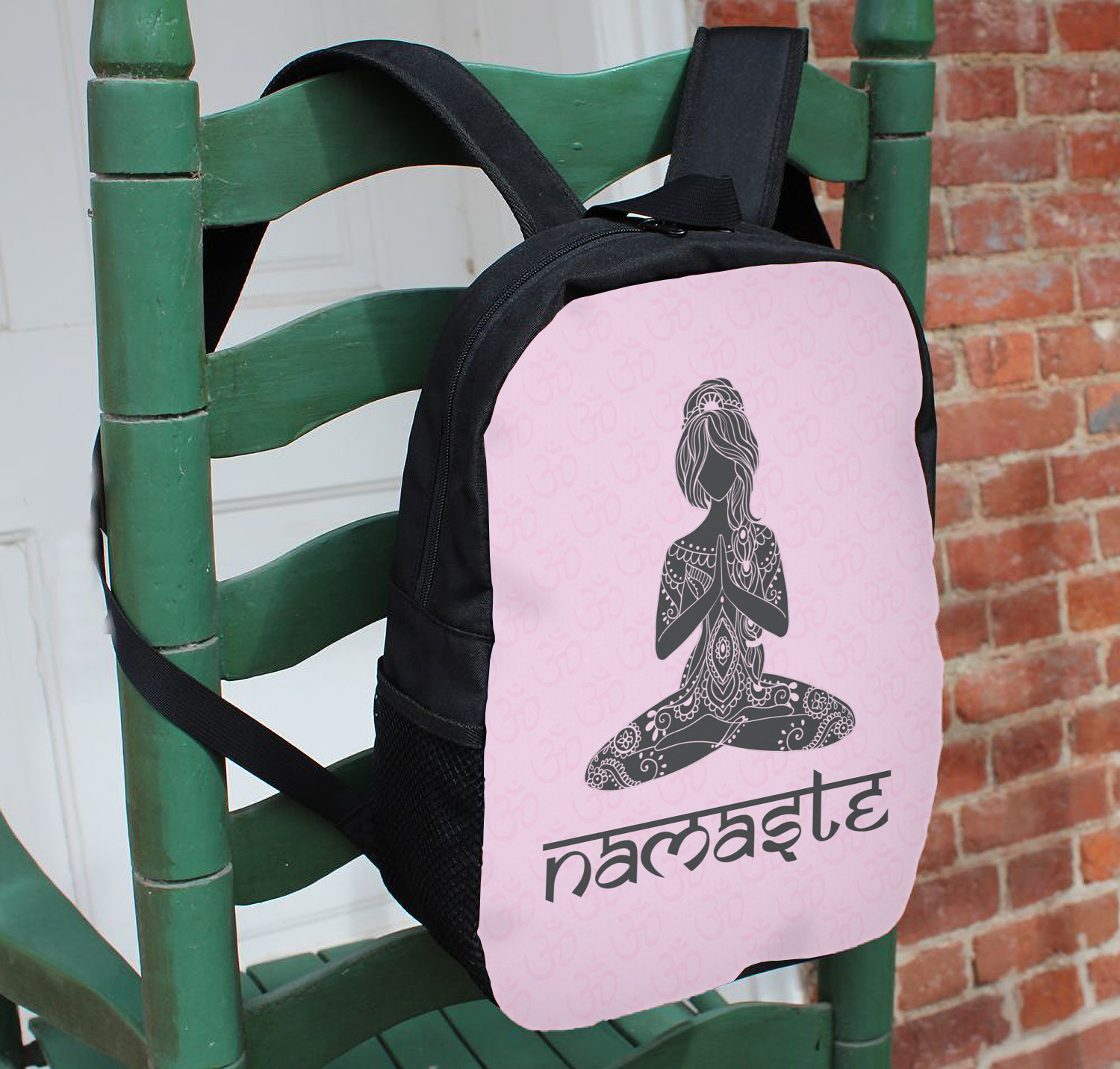 This design is customizable. We chose to use the om background with two shades of pink. We have other yoga backgrounds that you can choose from. We chose the large graphic and text style, where the graphic is of a beautiful woman sitting in lotus pose with prayer hands in pink and dark grey. We have many different yoga graphics that you can choose from including the tree pose and meditation pose. We chose to use the word Namaste in the Sanskrit font. You can choose the personalization, the font and the colors.