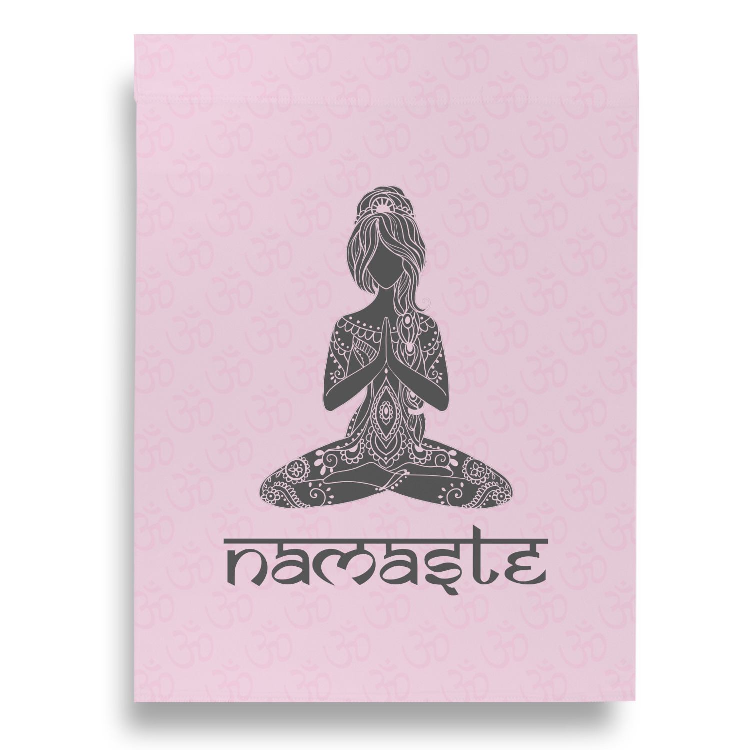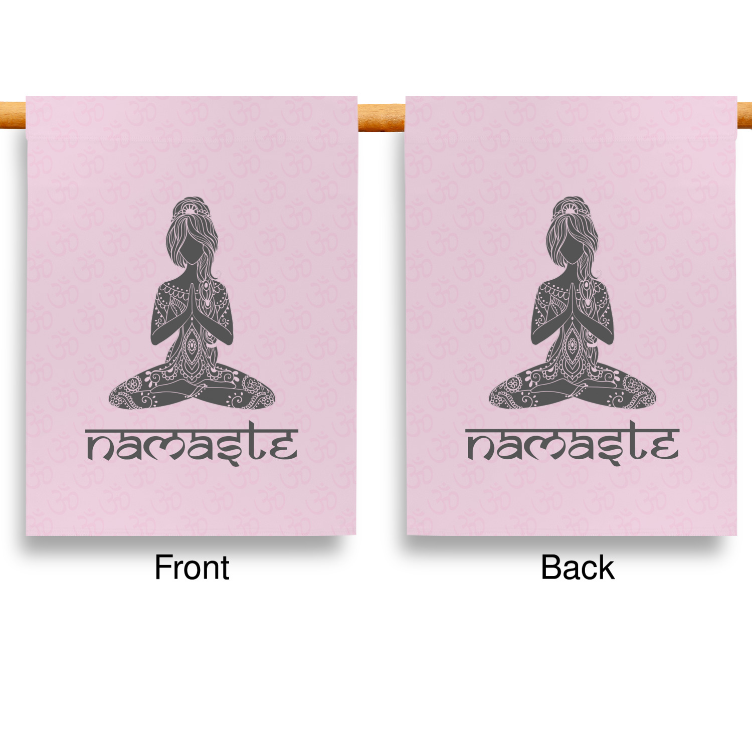 This design is customizable. We chose to use the om background with two shades of pink. We have other yoga backgrounds that you can choose from. We chose the large graphic and text style, where the graphic is of a beautiful woman sitting in lotus pose with prayer hands in pink and dark grey. We have many different yoga graphics that you can choose from including the tree pose and meditation pose. We chose to use the word Namaste in the Sanskrit font. You can choose the personalization, the font and the colors.