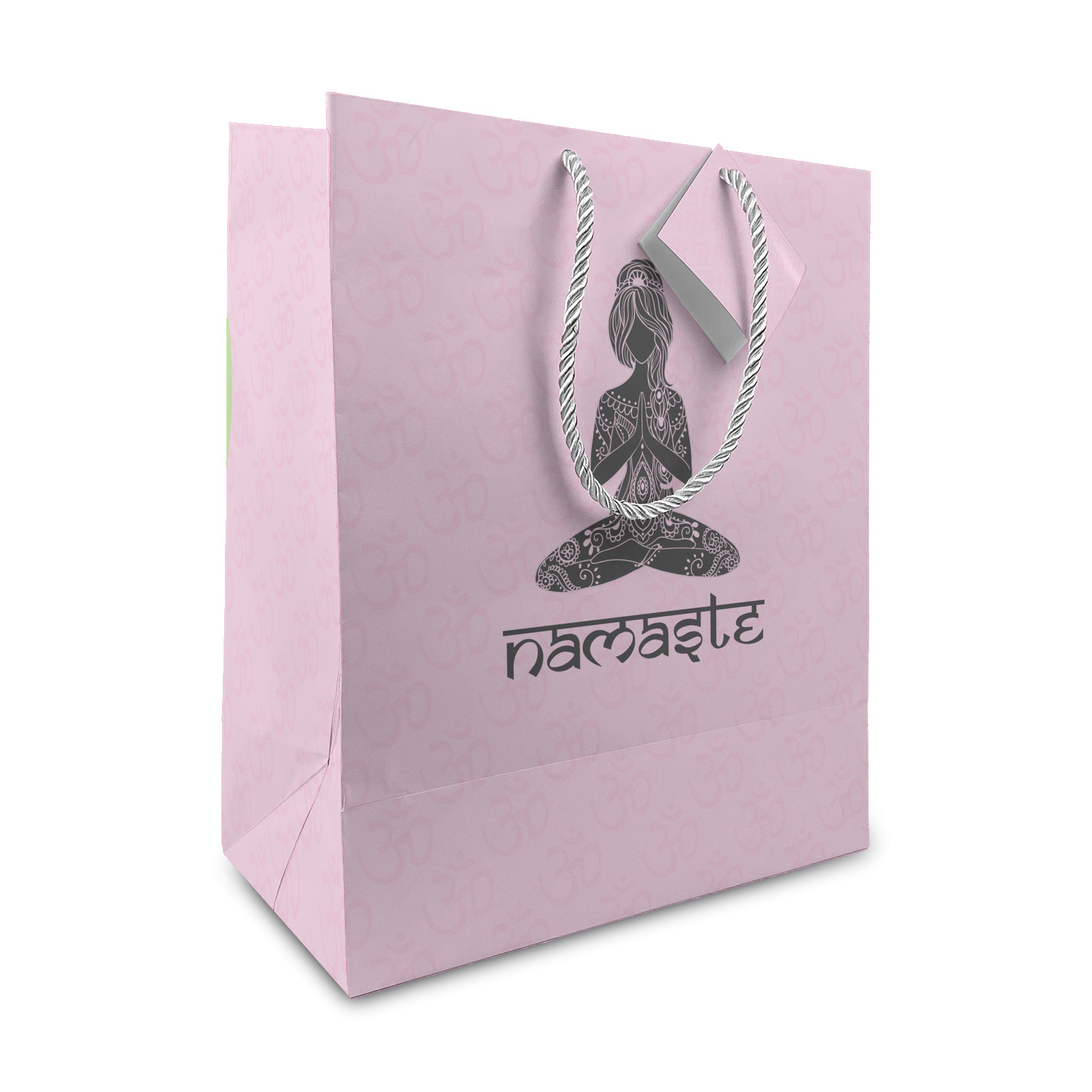 This design is customizable. We chose to use the om background with two shades of pink. We have other yoga backgrounds that you can choose from. We chose the large graphic and text style, where the graphic is of a beautiful woman sitting in lotus pose with prayer hands in pink and dark grey. We have many different yoga graphics that you can choose from including the tree pose and meditation pose. We chose to use the word Namaste in the Sanskrit font. You can choose the personalization, the font and the colors.