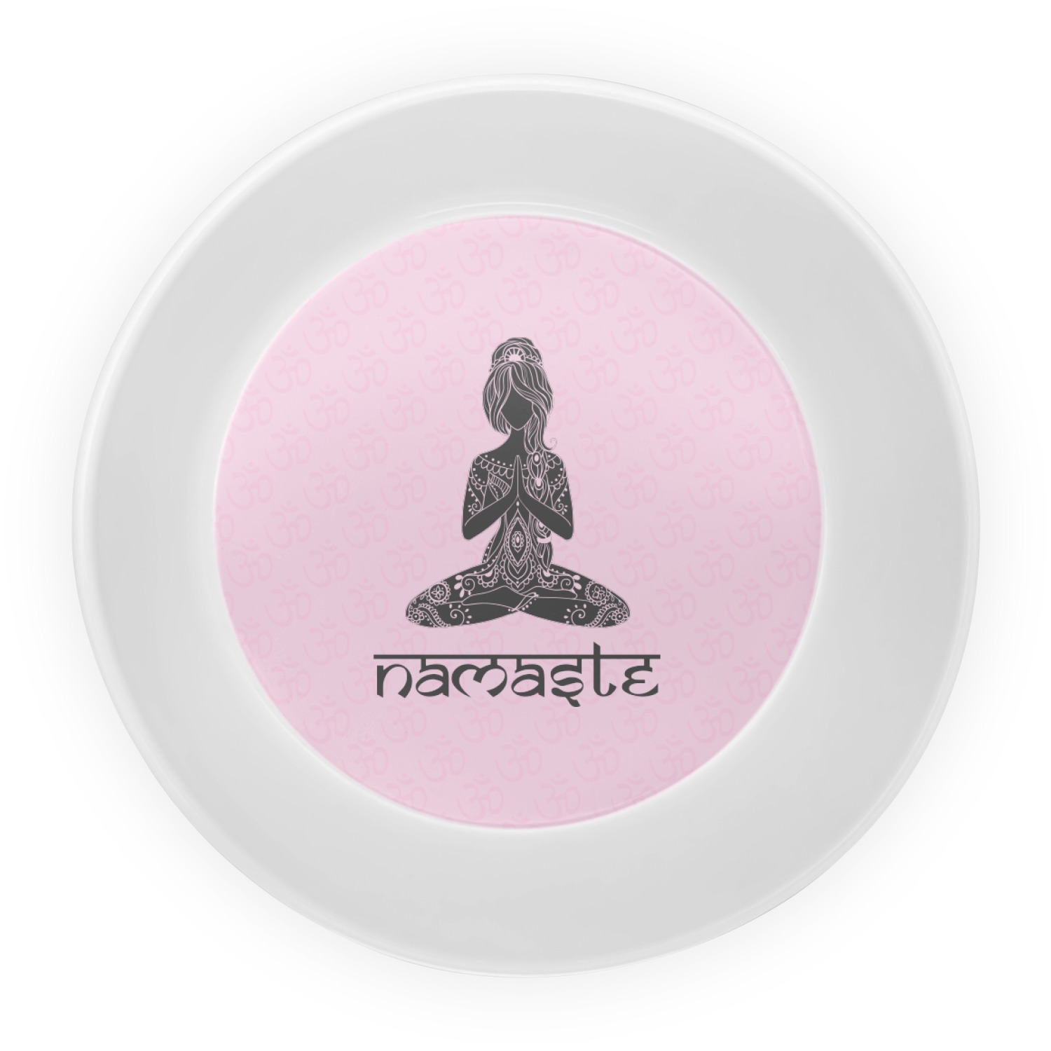 This design is customizable. We chose to use the om background with two shades of pink. We have other yoga backgrounds that you can choose from. We chose the large graphic and text style, where the graphic is of a beautiful woman sitting in lotus pose with prayer hands in pink and dark grey. We have many different yoga graphics that you can choose from including the tree pose and meditation pose. We chose to use the word Namaste in the Sanskrit font. You can choose the personalization, the font and the colors.