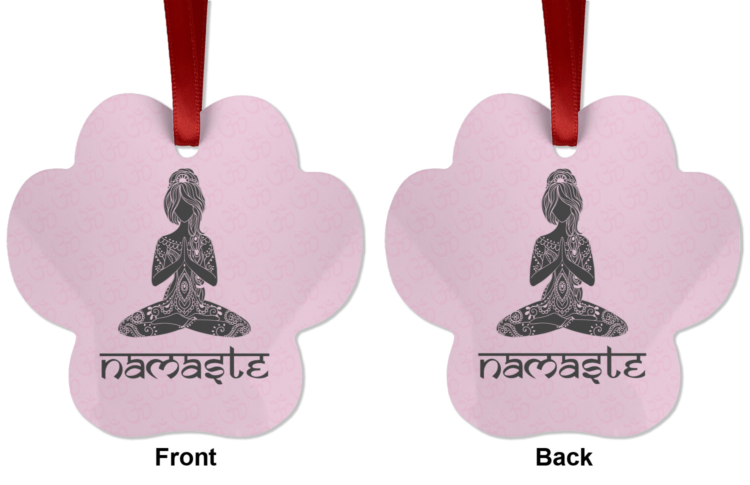 This design is customizable. We chose to use the om background with two shades of pink. We have other yoga backgrounds that you can choose from. We chose the large graphic and text style, where the graphic is of a beautiful woman sitting in lotus pose with prayer hands in pink and dark grey. We have many different yoga graphics that you can choose from including the tree pose and meditation pose. We chose to use the word Namaste in the Sanskrit font. You can choose the personalization, the font and the colors.