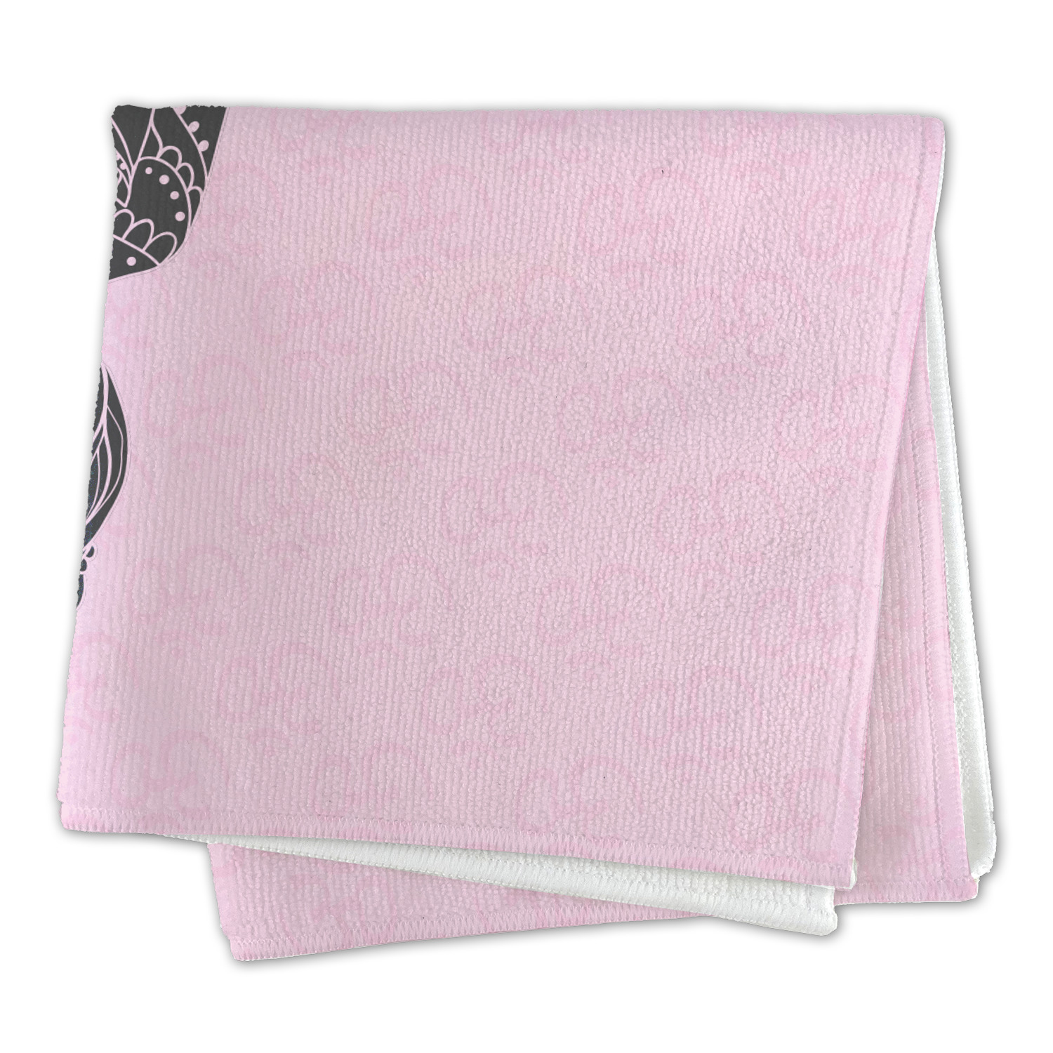 This design is customizable. We chose to use the om background with two shades of pink. We have other yoga backgrounds that you can choose from. We chose the large graphic and text style, where the graphic is of a beautiful woman sitting in lotus pose with prayer hands in pink and dark grey. We have many different yoga graphics that you can choose from including the tree pose and meditation pose. We chose to use the word Namaste in the Sanskrit font. You can choose the personalization, the font and the colors.