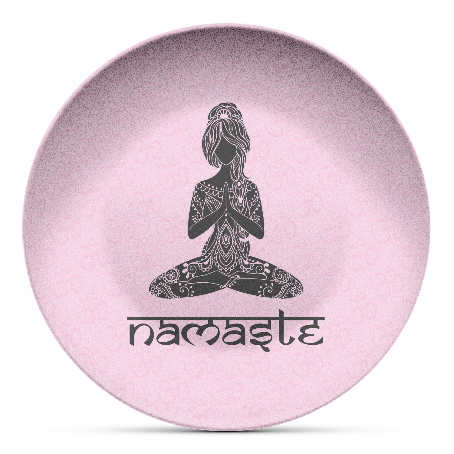 This design is customizable. We chose to use the om background with two shades of pink. We have other yoga backgrounds that you can choose from. We chose the large graphic and text style, where the graphic is of a beautiful woman sitting in lotus pose with prayer hands in pink and dark grey. We have many different yoga graphics that you can choose from including the tree pose and meditation pose. We chose to use the word Namaste in the Sanskrit font. You can choose the personalization, the font and the colors.