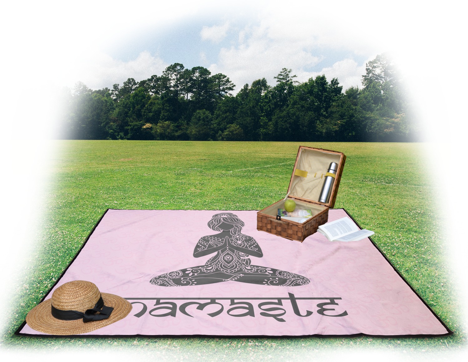 This picnic blanket is perfect for hanging out with your friends at the park or anywhere outside. The top of the blanket is made of a super soft microfiber fleece. The bottom of the blanket is made of a black material similar to a rain jacket and is water repellent as well. This will keep any wet spots on the ground from soaking through your picnic blanket. No one likes a wet blanket. The blanket measures at approximately 50" x 59" and has a nicely finished ribbon edge.