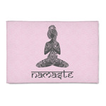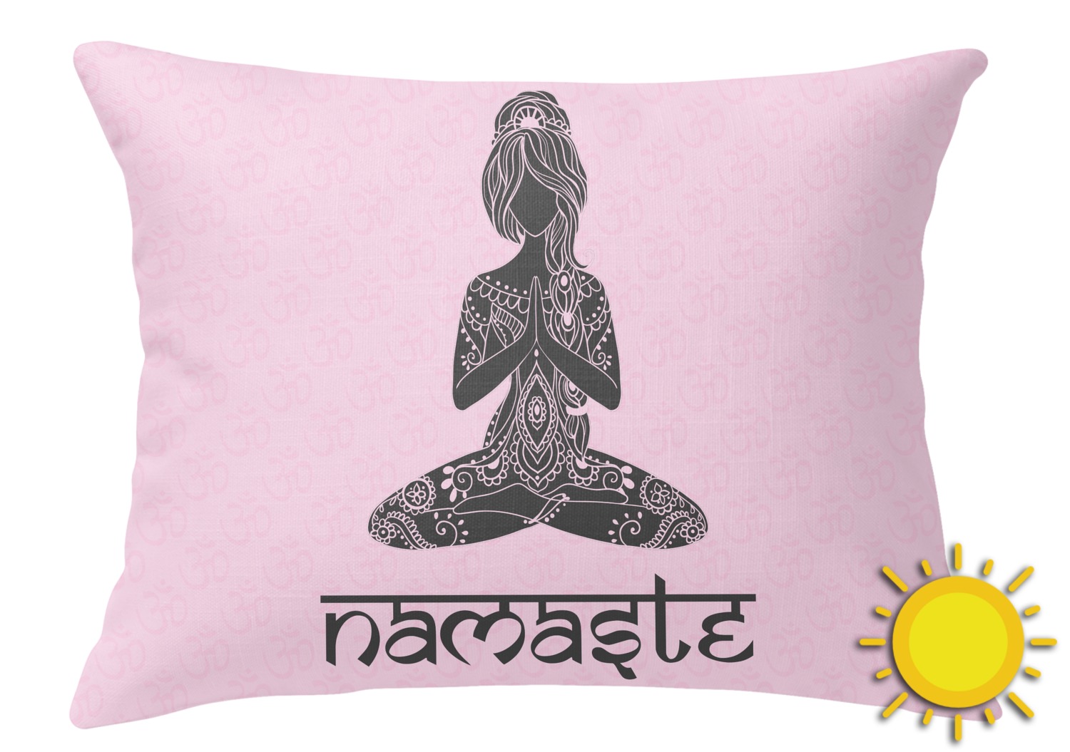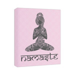 This design is customizable. We chose to use the om background with two shades of pink. We have other yoga backgrounds that you can choose from. We chose the large graphic and text style, where the graphic is of a beautiful woman sitting in lotus pose with prayer hands in pink and dark grey. We have many different yoga graphics that you can choose from including the tree pose and meditation pose. We chose to use the word Namaste in the Sanskrit font. You can choose the personalization, the font and the colors.