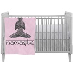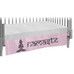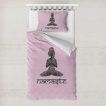 This design is customizable. We chose to use the om background with two shades of pink. We have other yoga backgrounds that you can choose from. We chose the large graphic and text style, where the graphic is of a beautiful woman sitting in lotus pose with prayer hands in pink and dark grey. We have many different yoga graphics that you can choose from including the tree pose and meditation pose. We chose to use the word Namaste in the Sanskrit font. You can choose the personalization, the font and the colors.