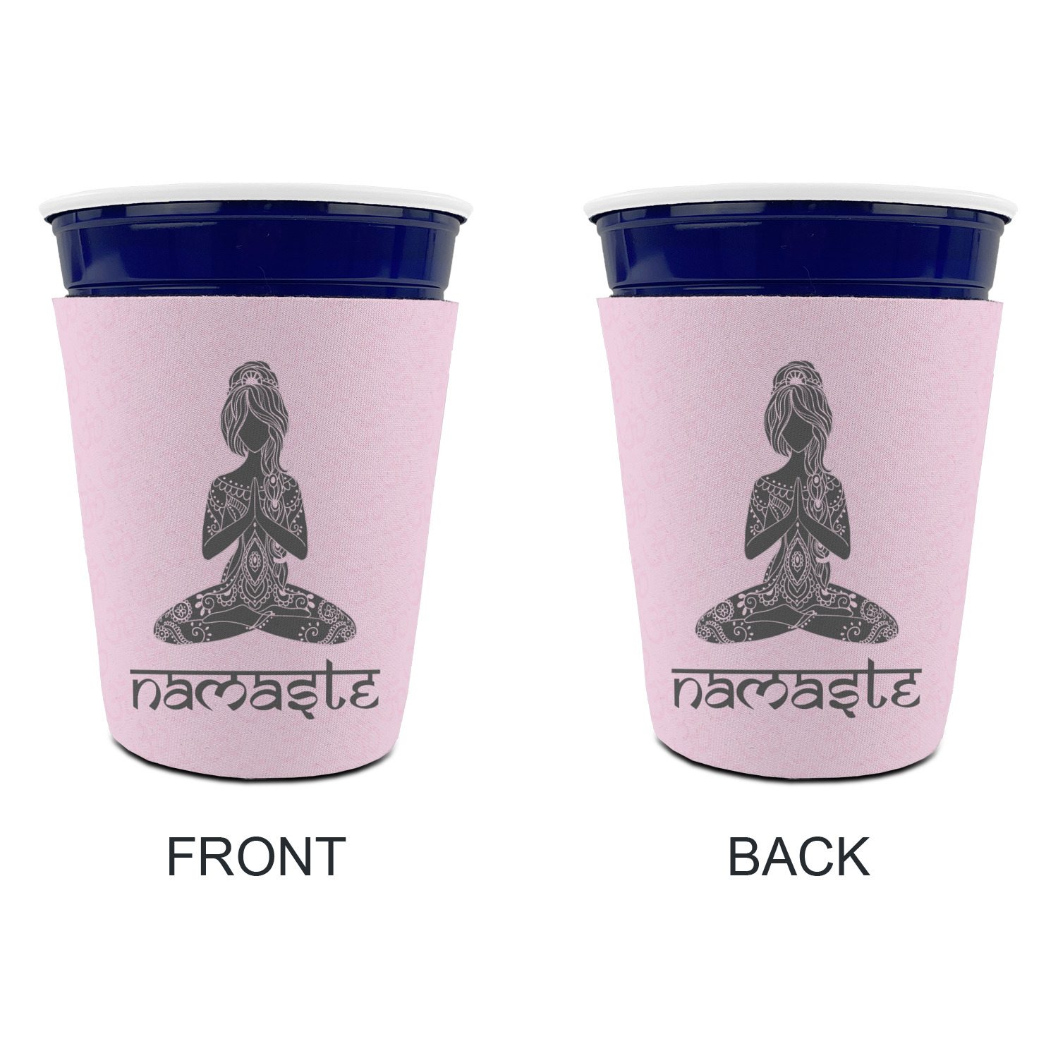 This design is customizable. We chose to use the om background with two shades of pink. We have other yoga backgrounds that you can choose from. We chose the large graphic and text style, where the graphic is of a beautiful woman sitting in lotus pose with prayer hands in pink and dark grey. We have many different yoga graphics that you can choose from including the tree pose and meditation pose. We chose to use the word Namaste in the Sanskrit font. You can choose the personalization, the font and the colors.