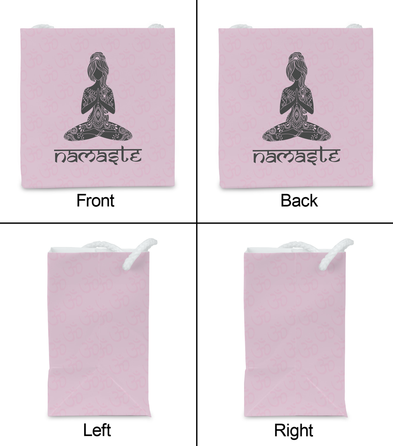 This design is customizable. We chose to use the om background with two shades of pink. We have other yoga backgrounds that you can choose from. We chose the large graphic and text style, where the graphic is of a beautiful woman sitting in lotus pose with prayer hands in pink and dark grey. We have many different yoga graphics that you can choose from including the tree pose and meditation pose. We chose to use the word Namaste in the Sanskrit font. You can choose the personalization, the font and the colors.