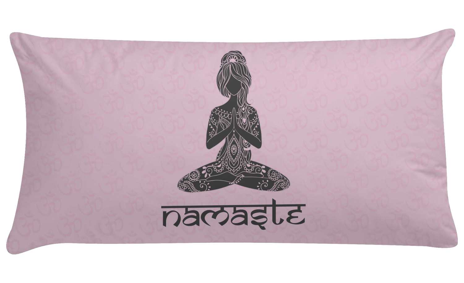This design is customizable. We chose to use the om background with two shades of pink. We have other yoga backgrounds that you can choose from. We chose the large graphic and text style, where the graphic is of a beautiful woman sitting in lotus pose with prayer hands in pink and dark grey. We have many different yoga graphics that you can choose from including the tree pose and meditation pose. We chose to use the word Namaste in the Sanskrit font. You can choose the personalization, the font and the colors.