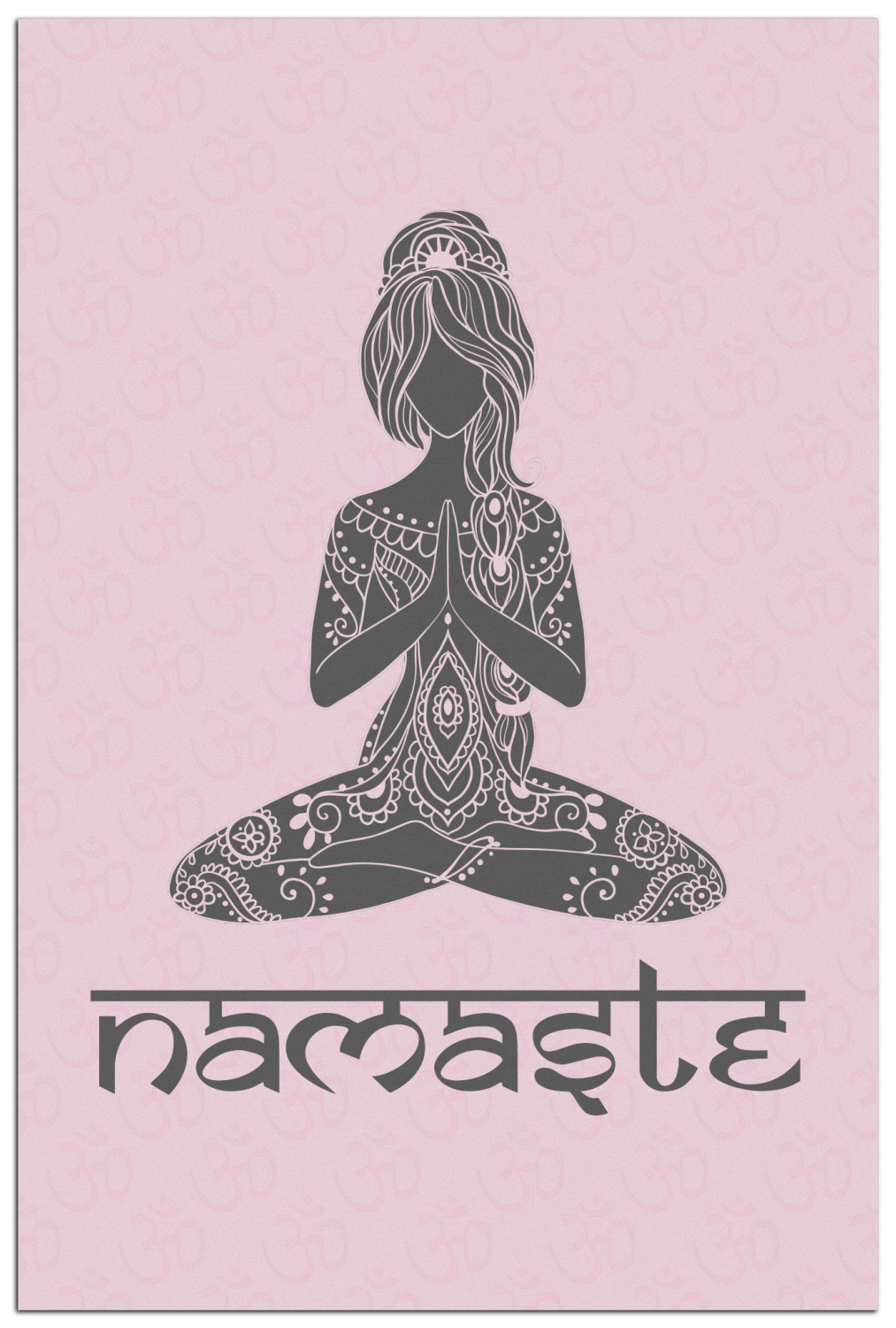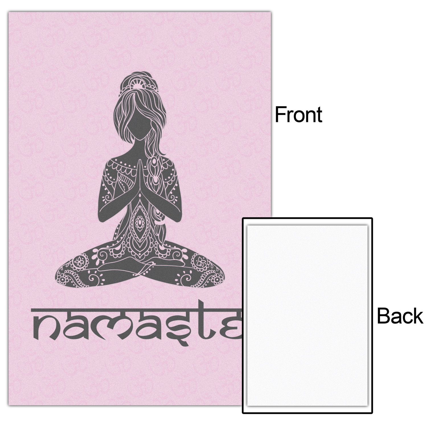 This design is customizable. We chose to use the om background with two shades of pink. We have other yoga backgrounds that you can choose from. We chose the large graphic and text style, where the graphic is of a beautiful woman sitting in lotus pose with prayer hands in pink and dark grey. We have many different yoga graphics that you can choose from including the tree pose and meditation pose. We chose to use the word Namaste in the Sanskrit font. You can choose the personalization, the font and the colors.