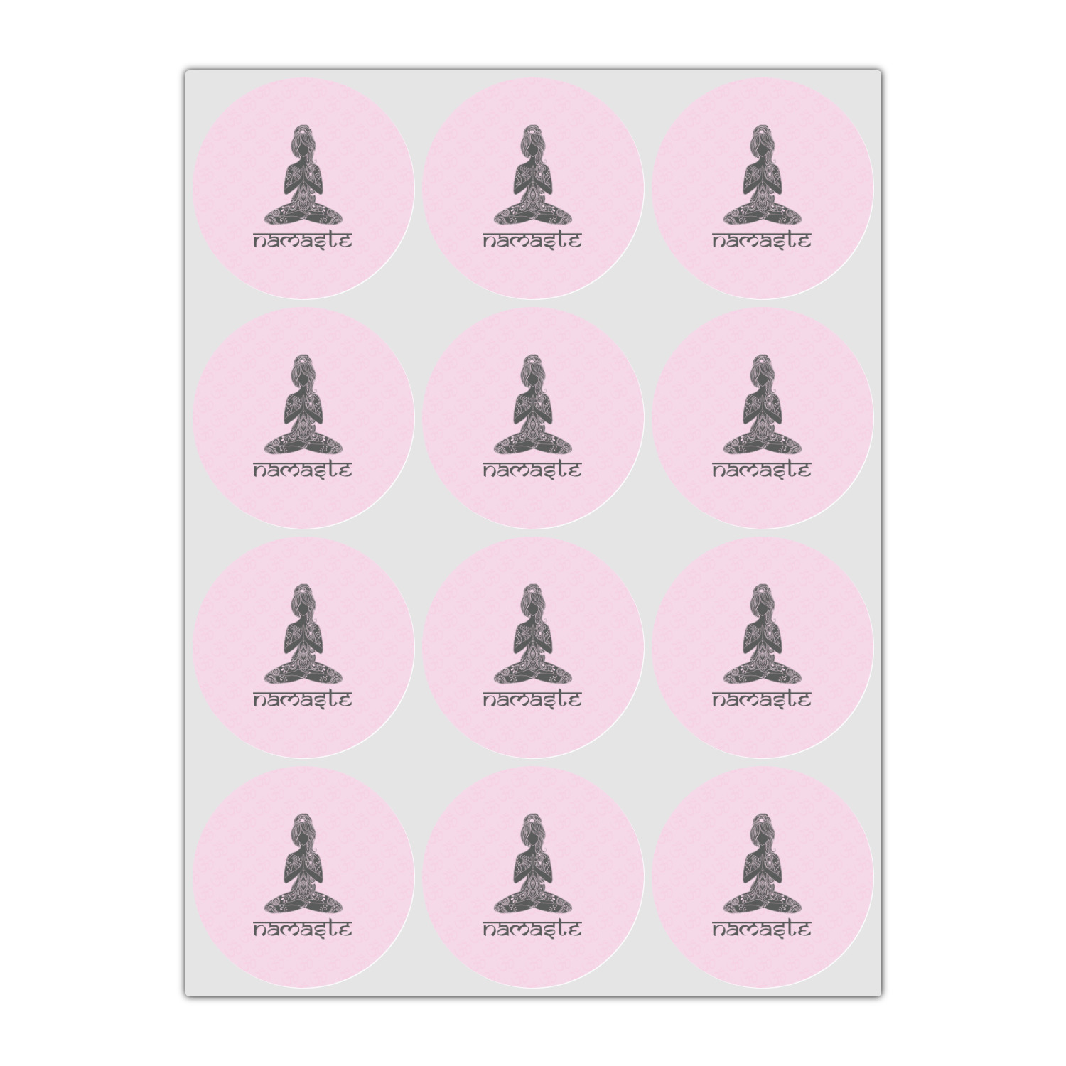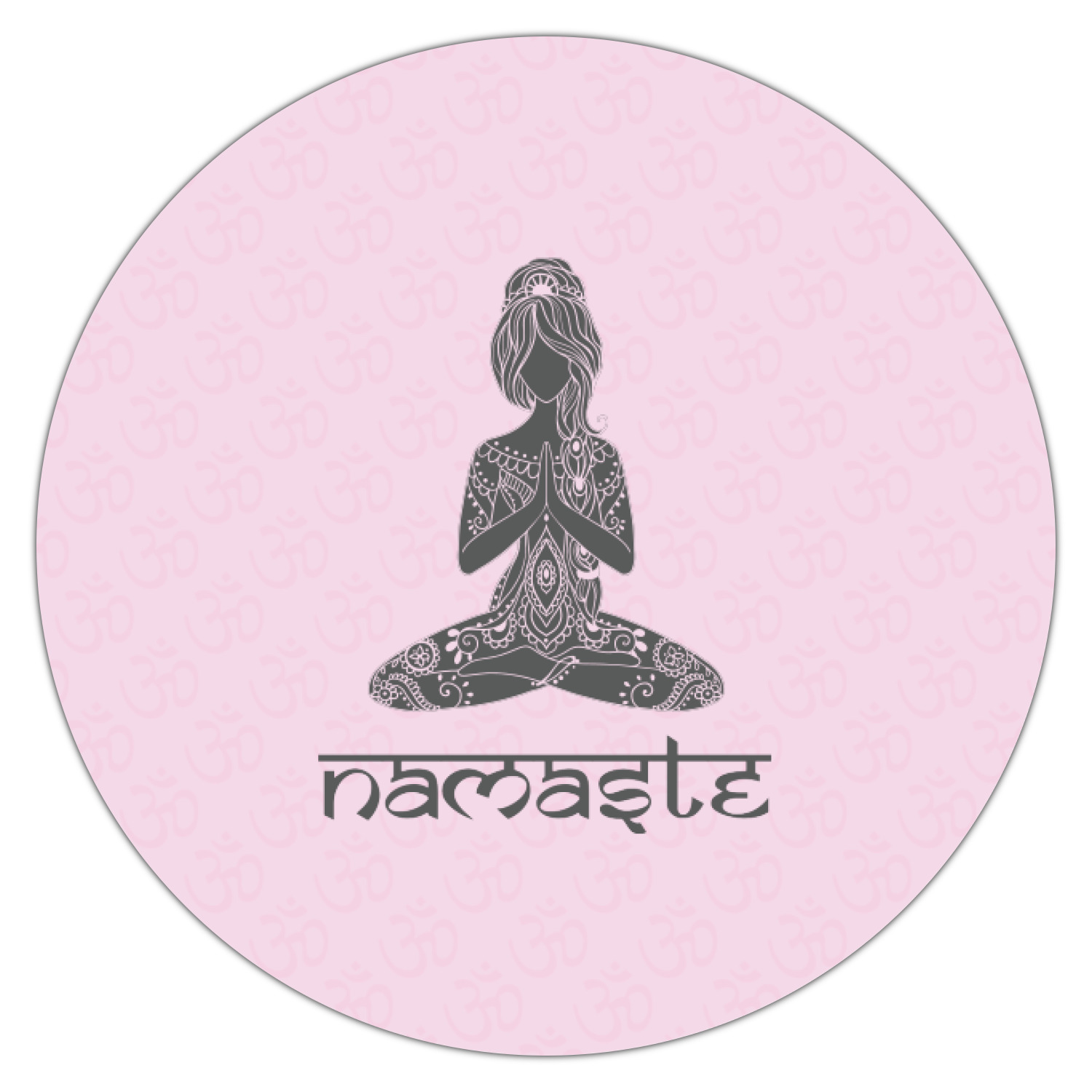 This design is customizable. We chose to use the om background with two shades of pink. We have other yoga backgrounds that you can choose from. We chose the large graphic and text style, where the graphic is of a beautiful woman sitting in lotus pose with prayer hands in pink and dark grey. We have many different yoga graphics that you can choose from including the tree pose and meditation pose. We chose to use the word Namaste in the Sanskrit font. You can choose the personalization, the font and the colors.