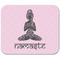This design is customizable. We chose to use the om background with two shades of pink. We have other yoga backgrounds that you can choose from. We chose the large graphic and text style, where the graphic is of a beautiful woman sitting in lotus pose with prayer hands in pink and dark grey. We have many different yoga graphics that you can choose from including the tree pose and meditation pose. We chose to use the word Namaste in the Sanskrit font. You can choose the personalization, the font and the colors.