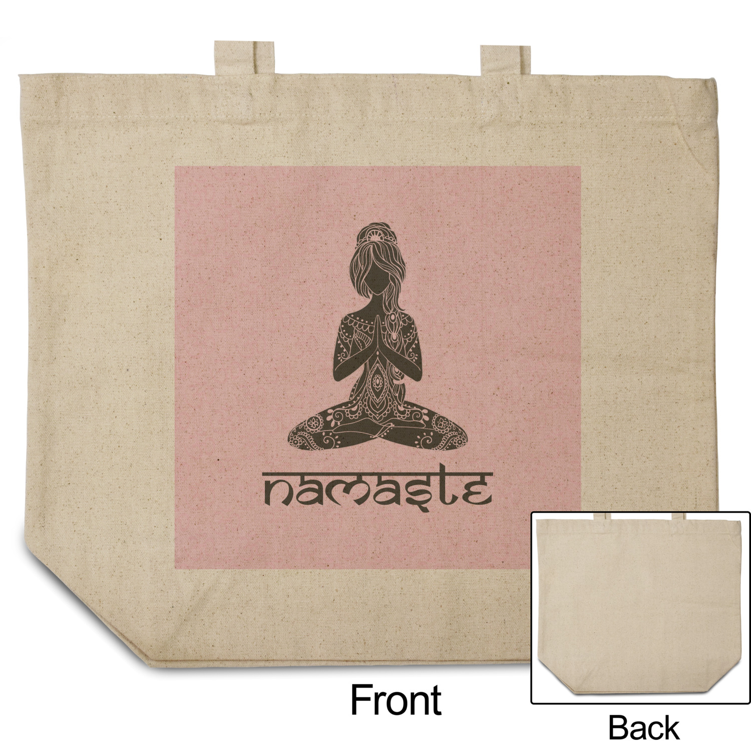 This design is customizable. We chose to use the om background with two shades of pink. We have other yoga backgrounds that you can choose from. We chose the large graphic and text style, where the graphic is of a beautiful woman sitting in lotus pose with prayer hands in pink and dark grey. We have many different yoga graphics that you can choose from including the tree pose and meditation pose. We chose to use the word Namaste in the Sanskrit font. You can choose the personalization, the font and the colors.