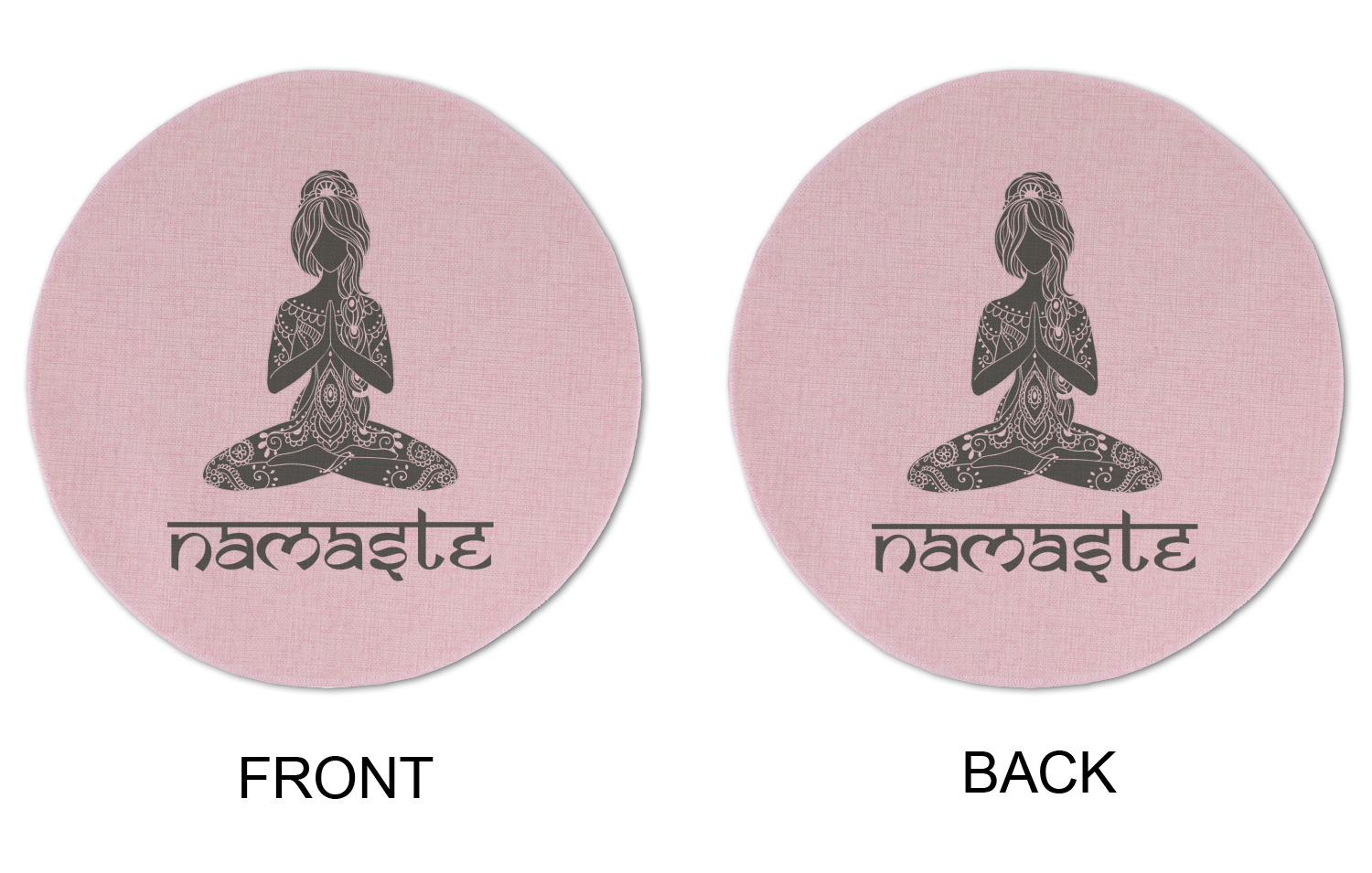 This design is customizable. We chose to use the om background with two shades of pink. We have other yoga backgrounds that you can choose from. We chose the large graphic and text style, where the graphic is of a beautiful woman sitting in lotus pose with prayer hands in pink and dark grey. We have many different yoga graphics that you can choose from including the tree pose and meditation pose. We chose to use the word Namaste in the Sanskrit font. You can choose the personalization, the font and the colors.