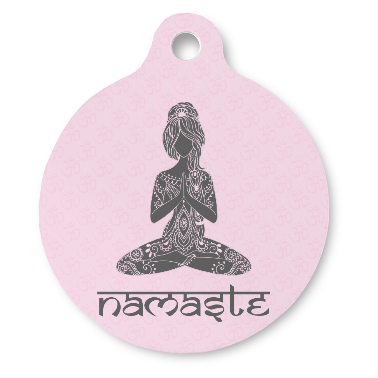 This design is customizable. We chose to use the om background with two shades of pink. We have other yoga backgrounds that you can choose from. We chose the large graphic and text style, where the graphic is of a beautiful woman sitting in lotus pose with prayer hands in pink and dark grey. We have many different yoga graphics that you can choose from including the tree pose and meditation pose. We chose to use the word Namaste in the Sanskrit font. You can choose the personalization, the font and the colors.