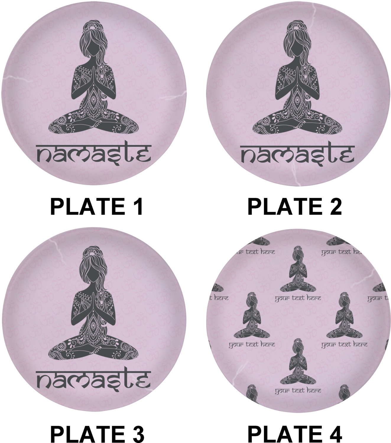 This design is customizable. We chose to use the om background with two shades of pink. We have other yoga backgrounds that you can choose from. We chose the large graphic and text style, where the graphic is of a beautiful woman sitting in lotus pose with prayer hands in pink and dark grey. We have many different yoga graphics that you can choose from including the tree pose and meditation pose. We chose to use the word Namaste in the Sanskrit font. You can choose the personalization, the font and the colors.