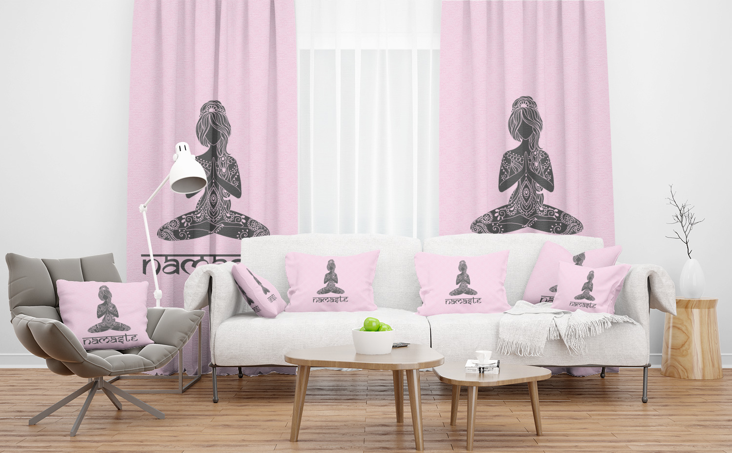 This design is customizable. We chose to use the om background with two shades of pink. We have other yoga backgrounds that you can choose from. We chose the large graphic and text style, where the graphic is of a beautiful woman sitting in lotus pose with prayer hands in pink and dark grey. We have many different yoga graphics that you can choose from including the tree pose and meditation pose. We chose to use the word Namaste in the Sanskrit font. You can choose the personalization, the font and the colors.