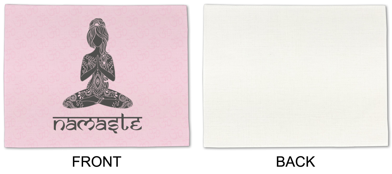 This design is customizable. We chose to use the om background with two shades of pink. We have other yoga backgrounds that you can choose from. We chose the large graphic and text style, where the graphic is of a beautiful woman sitting in lotus pose with prayer hands in pink and dark grey. We have many different yoga graphics that you can choose from including the tree pose and meditation pose. We chose to use the word Namaste in the Sanskrit font. You can choose the personalization, the font and the colors.