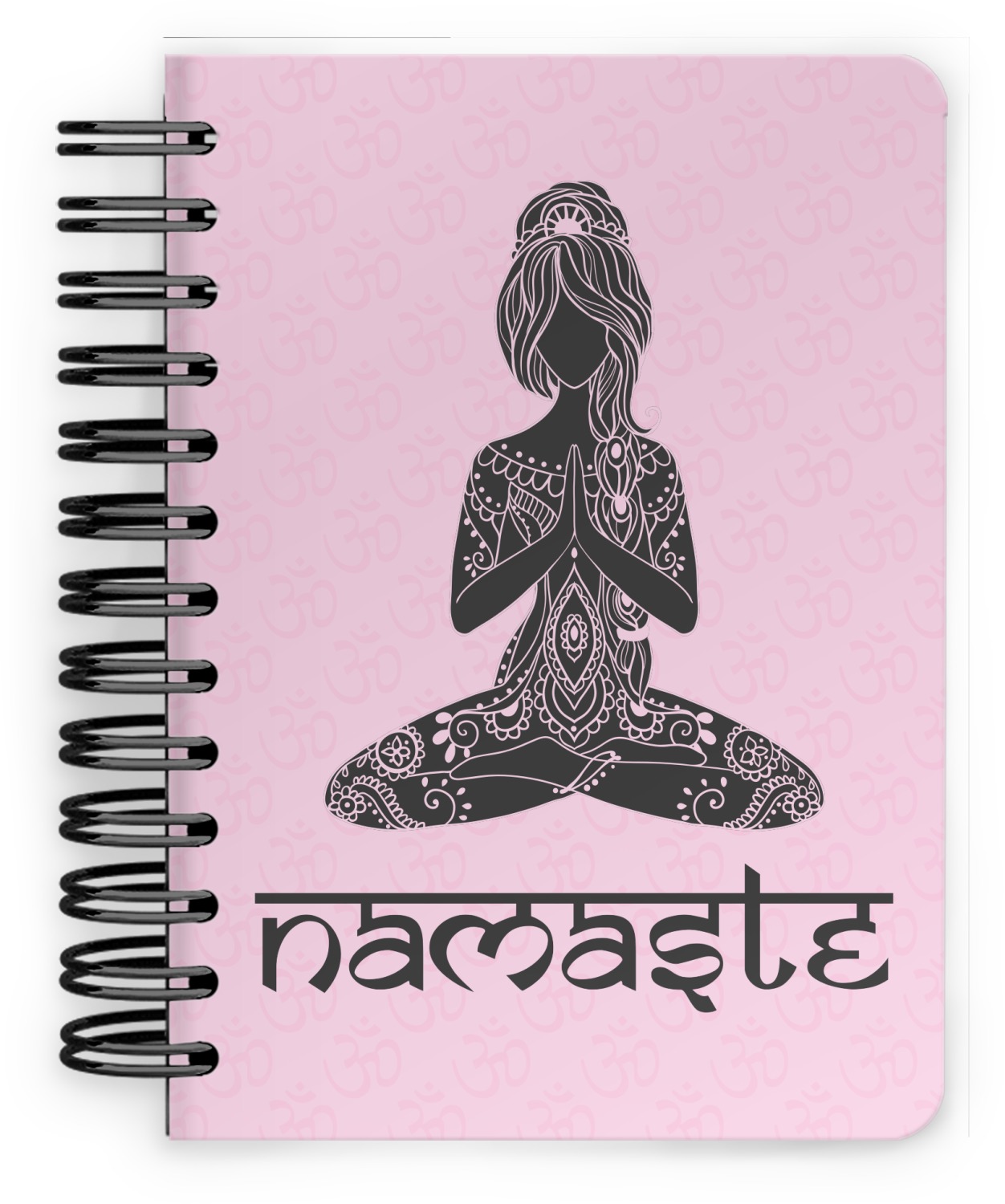 This design is customizable. We chose to use the om background with two shades of pink. We have other yoga backgrounds that you can choose from. We chose the large graphic and text style, where the graphic is of a beautiful woman sitting in lotus pose with prayer hands in pink and dark grey. We have many different yoga graphics that you can choose from including the tree pose and meditation pose. We chose to use the word Namaste in the Sanskrit font. You can choose the personalization, the font and the colors.