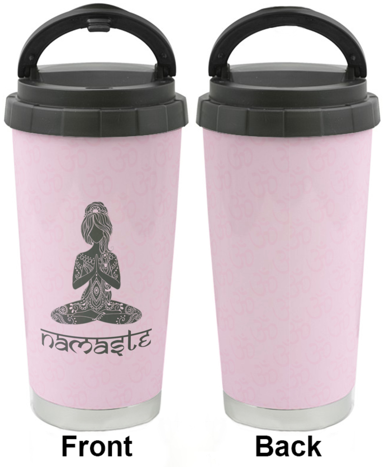This design is customizable. We chose to use the om background with two shades of pink. We have other yoga backgrounds that you can choose from. We chose the large graphic and text style, where the graphic is of a beautiful woman sitting in lotus pose with prayer hands in pink and dark grey. We have many different yoga graphics that you can choose from including the tree pose and meditation pose. We chose to use the word Namaste in the Sanskrit font. You can choose the personalization, the font and the colors.