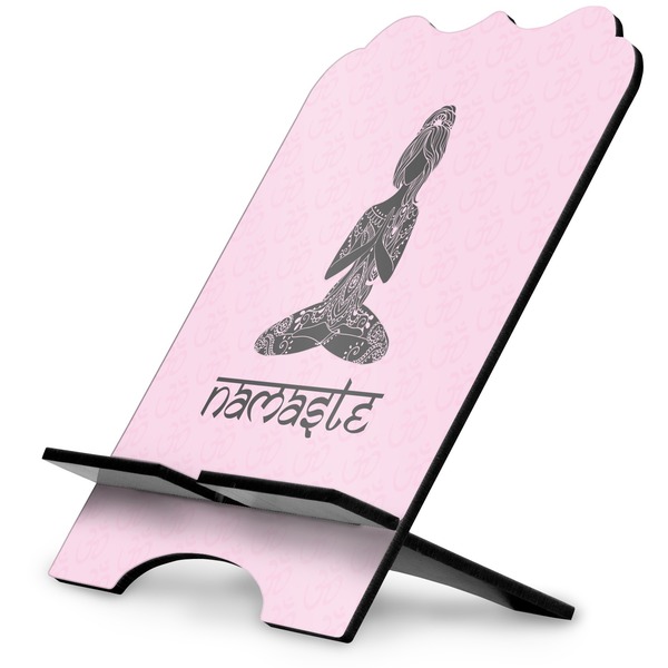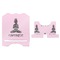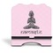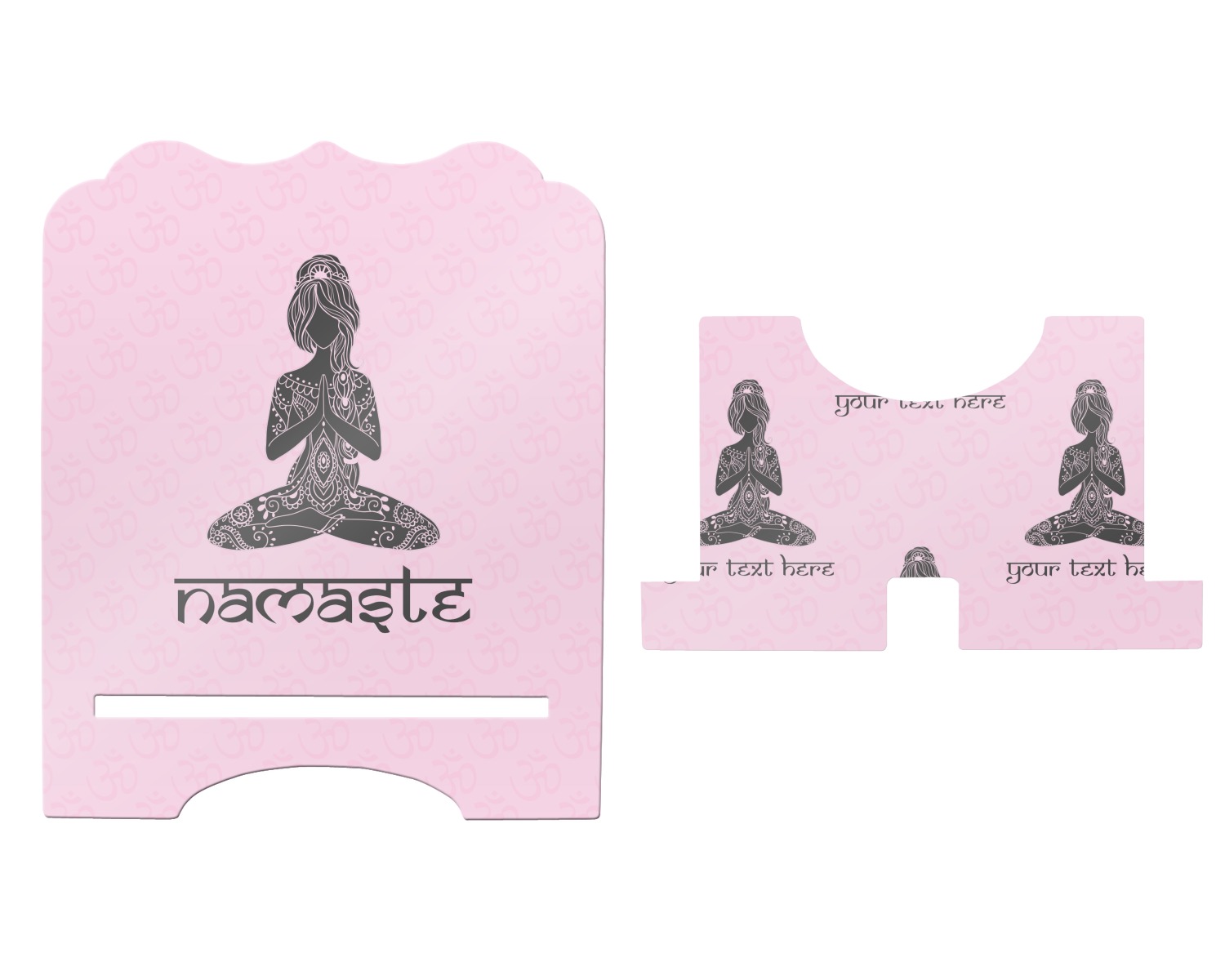 This design is customizable. We chose to use the om background with two shades of pink. We have other yoga backgrounds that you can choose from. We chose the large graphic and text style, where the graphic is of a beautiful woman sitting in lotus pose with prayer hands in pink and dark grey. We have many different yoga graphics that you can choose from including the tree pose and meditation pose. We chose to use the word Namaste in the Sanskrit font. You can choose the personalization, the font and the colors.