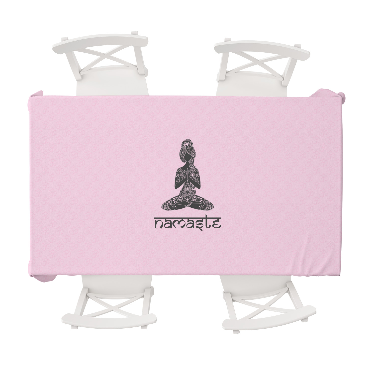 This design is customizable. We chose to use the om background with two shades of pink. We have other yoga backgrounds that you can choose from. We chose the large graphic and text style, where the graphic is of a beautiful woman sitting in lotus pose with prayer hands in pink and dark grey. We have many different yoga graphics that you can choose from including the tree pose and meditation pose. We chose to use the word Namaste in the Sanskrit font. You can choose the personalization, the font and the colors.