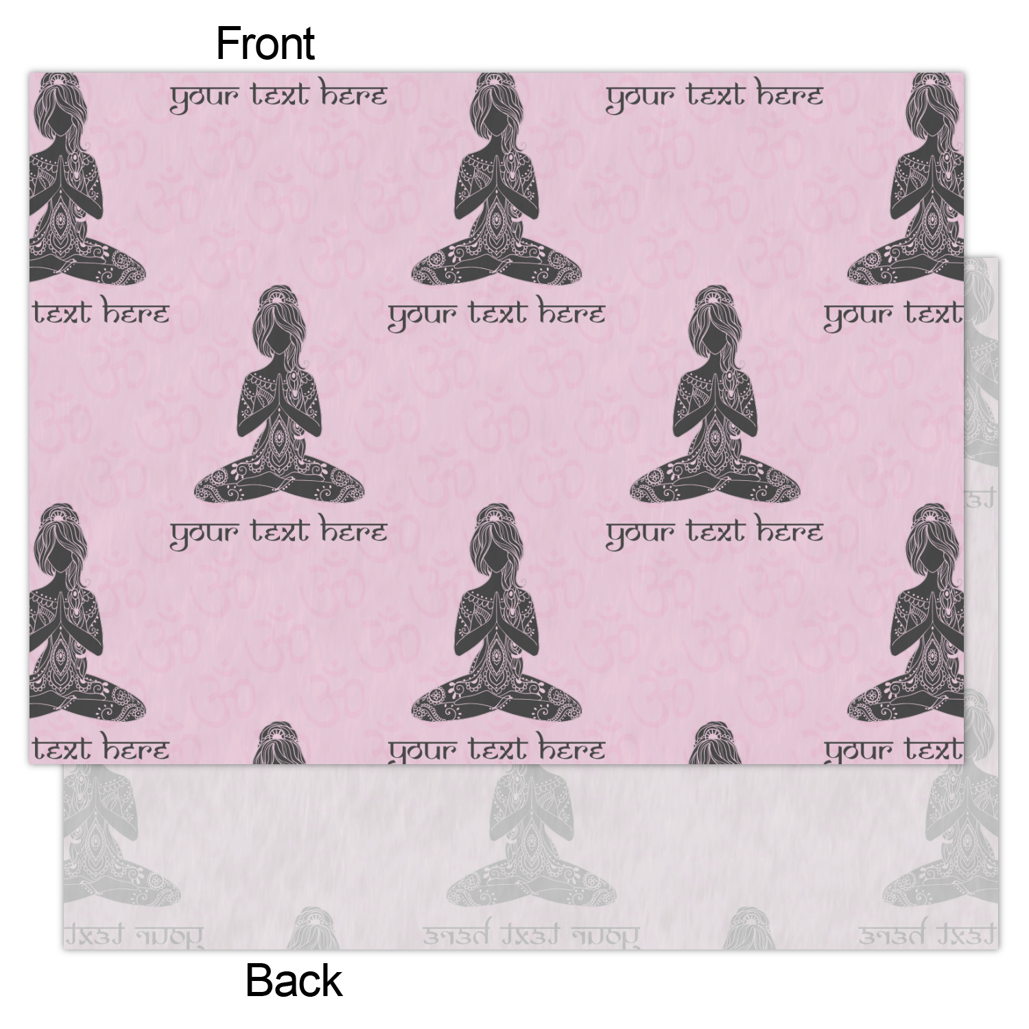This design is customizable. We chose to use the om background with two shades of pink. We have other yoga backgrounds that you can choose from. We chose the large graphic and text style, where the graphic is of a beautiful woman sitting in lotus pose with prayer hands in pink and dark grey. We have many different yoga graphics that you can choose from including the tree pose and meditation pose. We chose to use the word Namaste in the Sanskrit font. You can choose the personalization, the font and the colors.