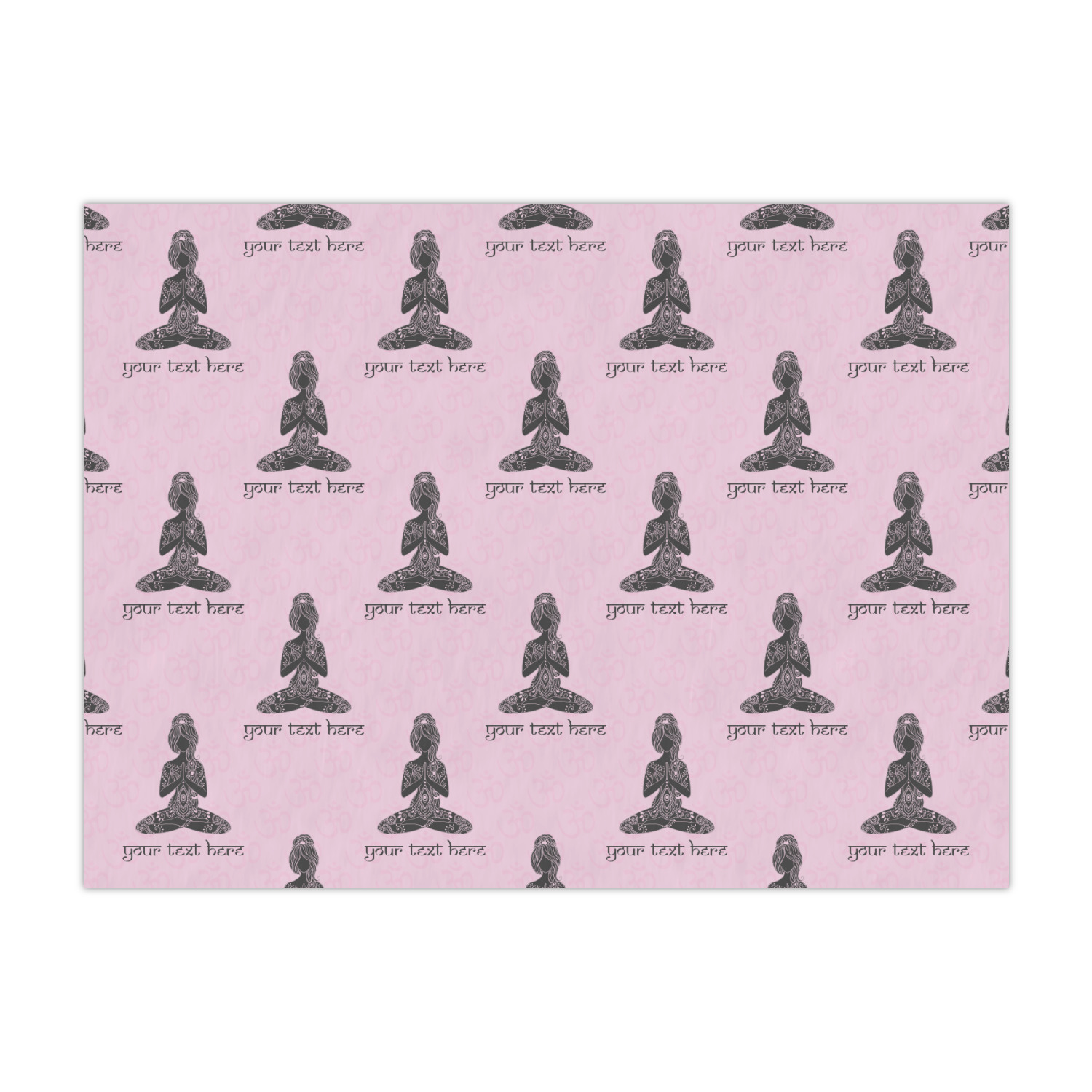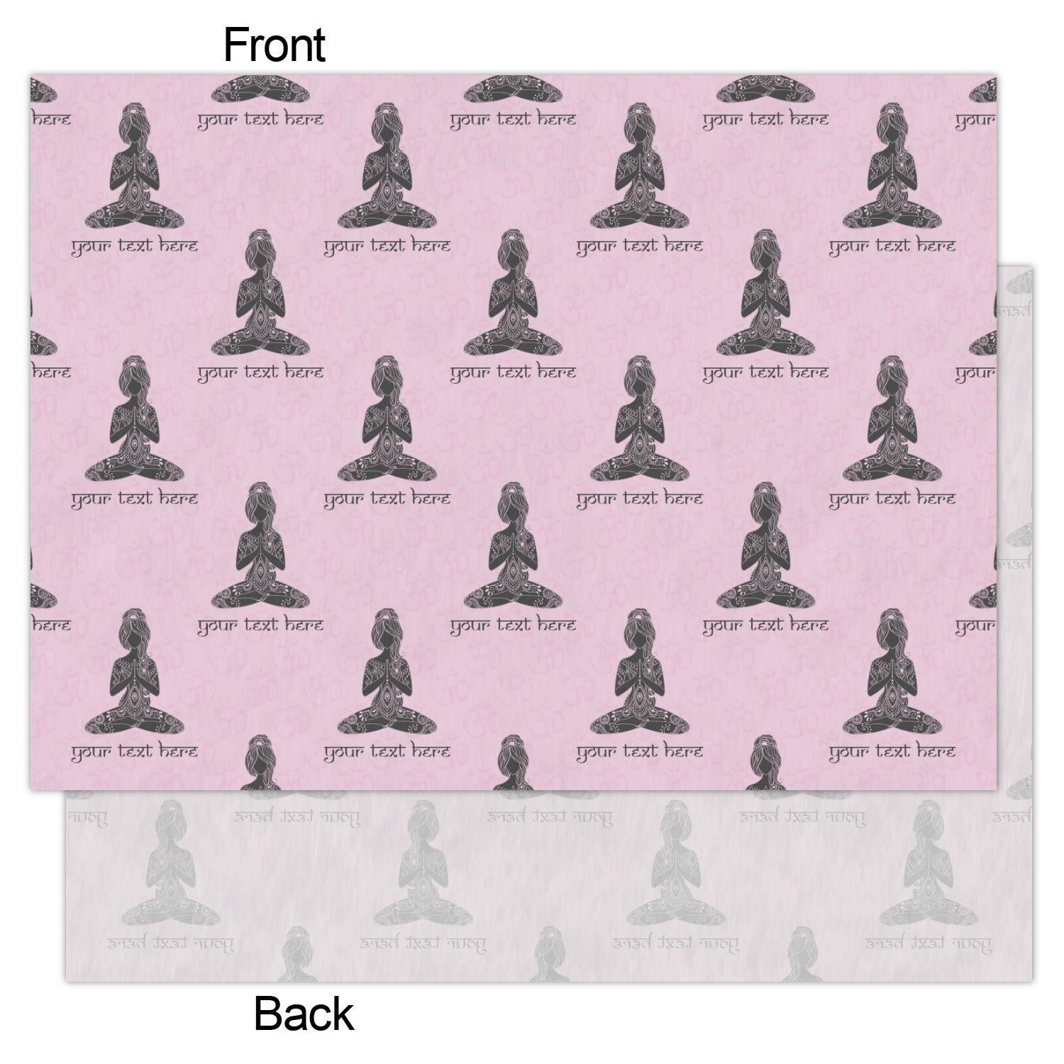 This design is customizable. We chose to use the om background with two shades of pink. We have other yoga backgrounds that you can choose from. We chose the large graphic and text style, where the graphic is of a beautiful woman sitting in lotus pose with prayer hands in pink and dark grey. We have many different yoga graphics that you can choose from including the tree pose and meditation pose. We chose to use the word Namaste in the Sanskrit font. You can choose the personalization, the font and the colors.