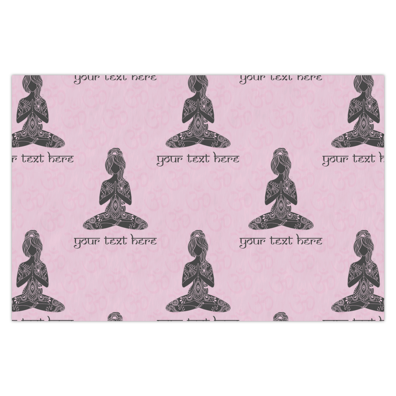 This design is customizable. We chose to use the om background with two shades of pink. We have other yoga backgrounds that you can choose from. We chose the large graphic and text style, where the graphic is of a beautiful woman sitting in lotus pose with prayer hands in pink and dark grey. We have many different yoga graphics that you can choose from including the tree pose and meditation pose. We chose to use the word Namaste in the Sanskrit font. You can choose the personalization, the font and the colors.