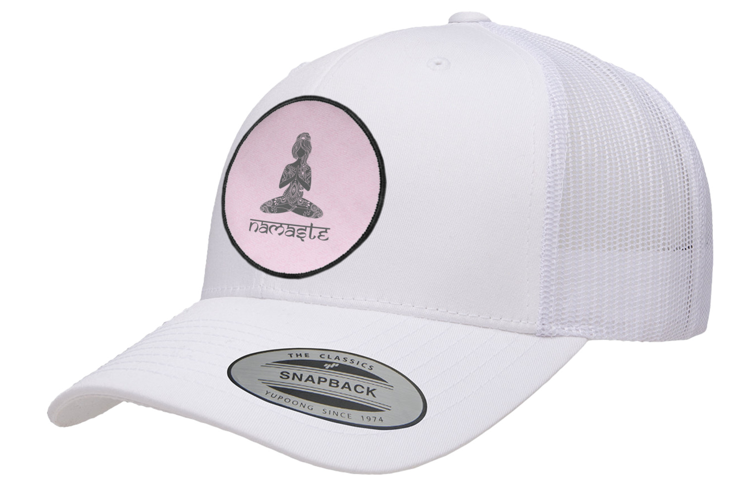 This design is customizable. We chose to use the om background with two shades of pink. We have other yoga backgrounds that you can choose from. We chose the large graphic and text style, where the graphic is of a beautiful woman sitting in lotus pose with prayer hands in pink and dark grey. We have many different yoga graphics that you can choose from including the tree pose and meditation pose. We chose to use the word Namaste in the Sanskrit font. You can choose the personalization, the font and the colors.