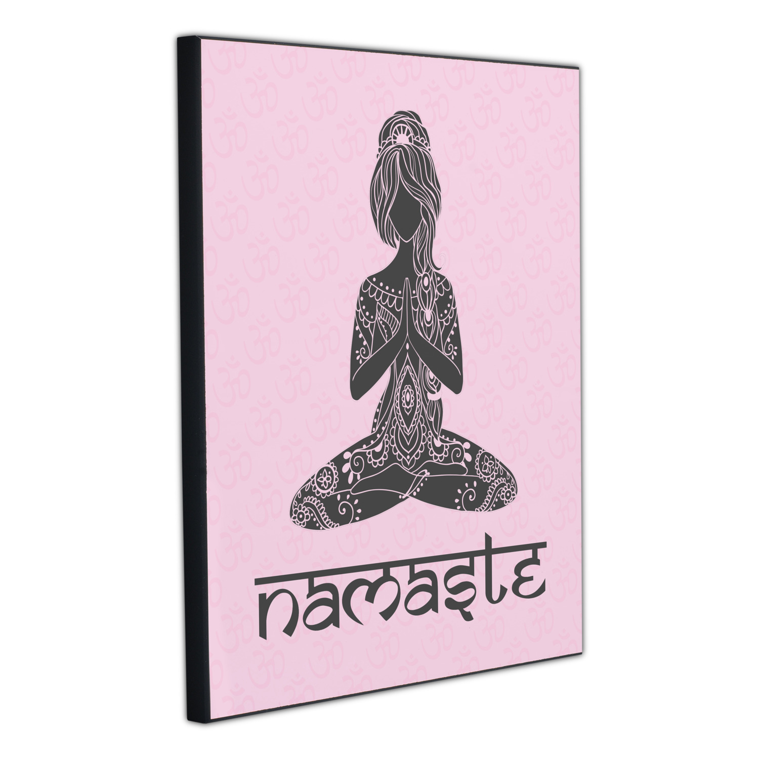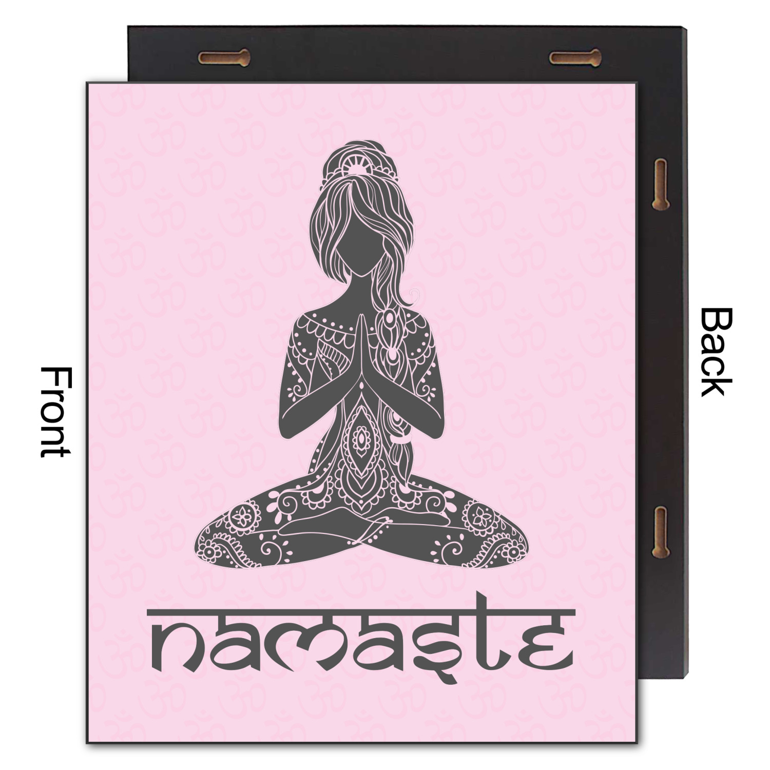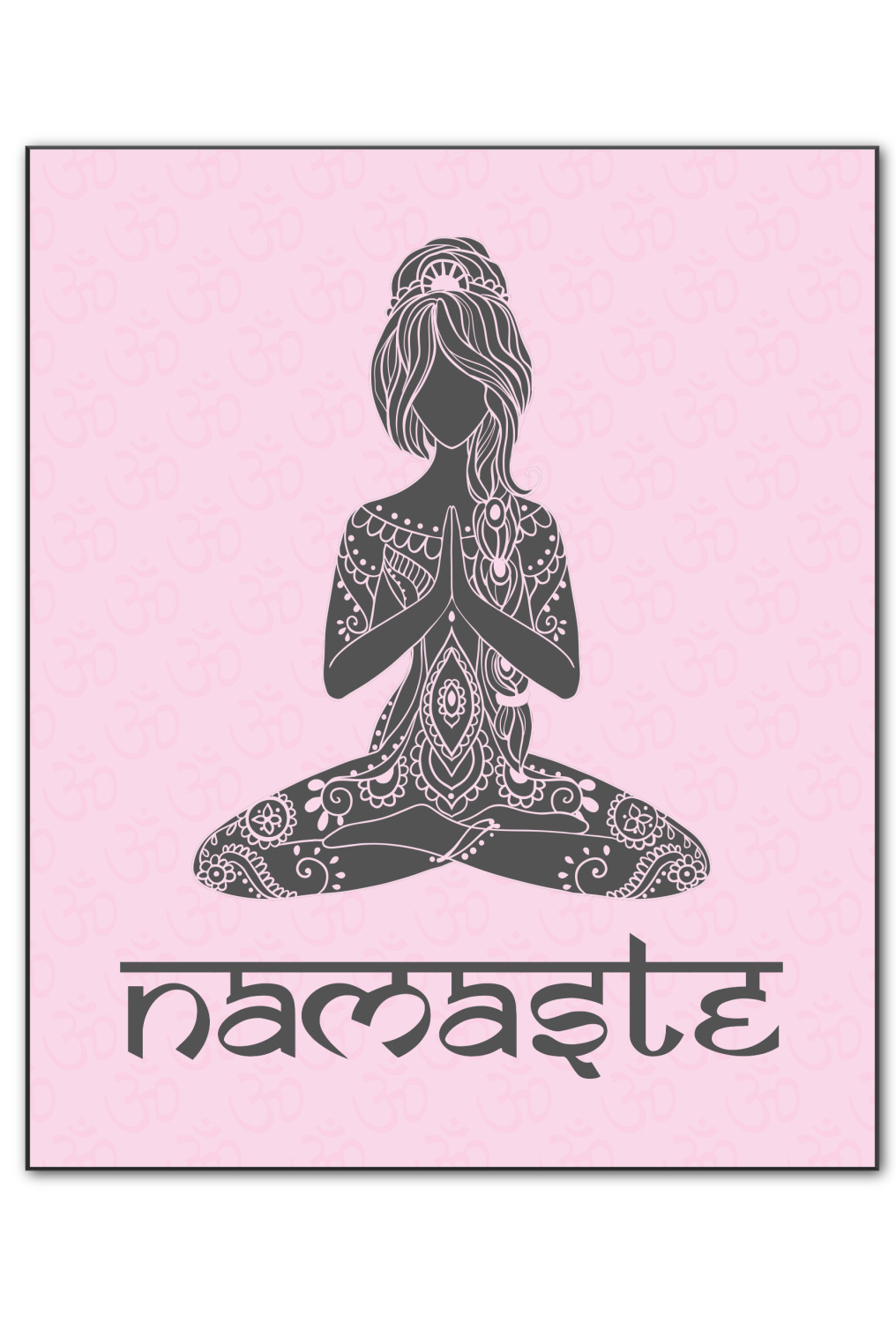 This design is customizable. We chose to use the om background with two shades of pink. We have other yoga backgrounds that you can choose from. We chose the large graphic and text style, where the graphic is of a beautiful woman sitting in lotus pose with prayer hands in pink and dark grey. We have many different yoga graphics that you can choose from including the tree pose and meditation pose. We chose to use the word Namaste in the Sanskrit font. You can choose the personalization, the font and the colors.